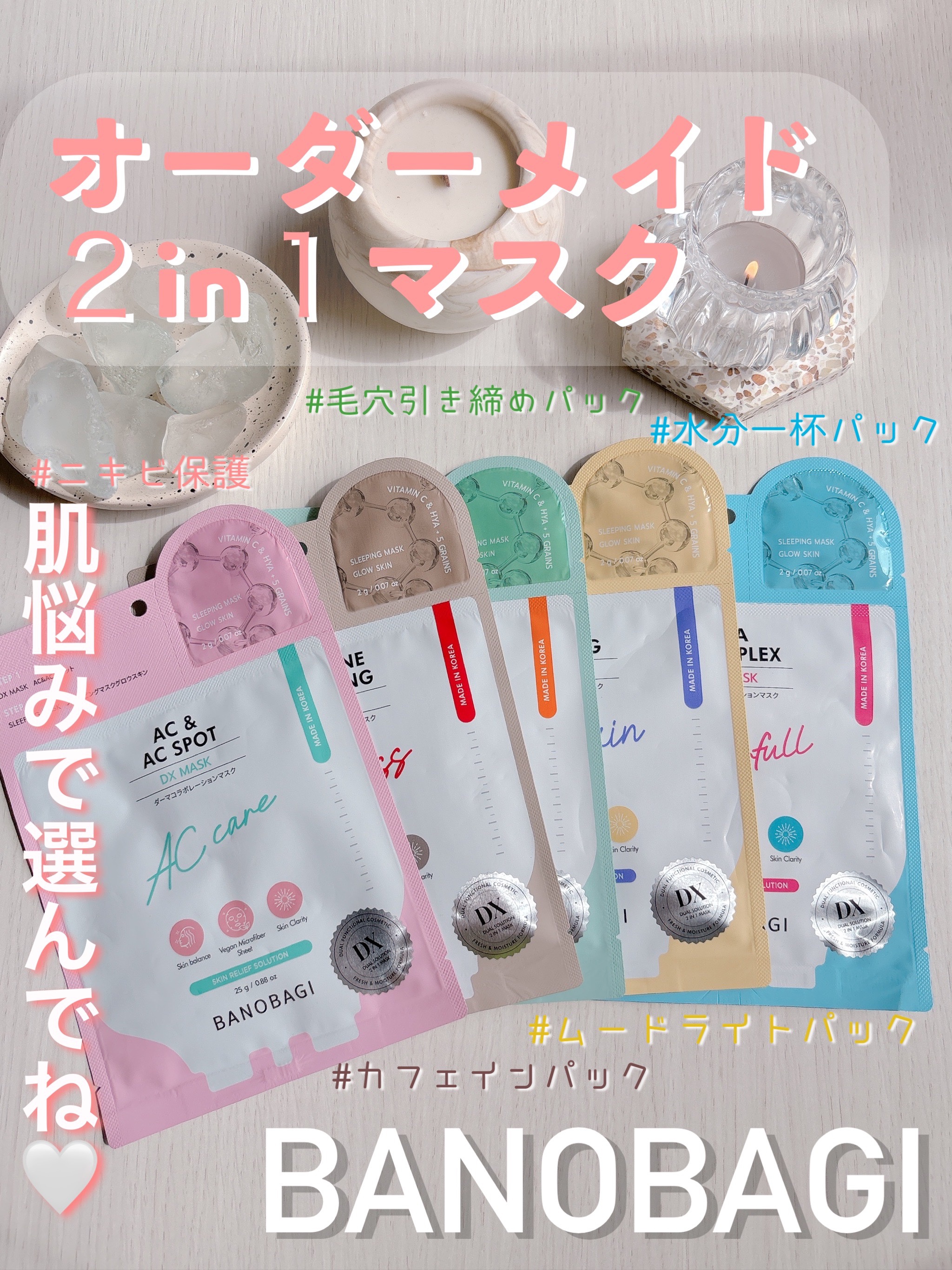 BANOBAGIバノバギDXマスク全5種類¥2,7001箱7枚入り◾︎AC&ACスポット◾︎アンチセボムフォア◾︎カフェイン&ファーミング◾︎ヒヤアクアフレックス◾︎ブライト&ヤング☝🏻̖́-ポイント・自分の肌悩みに合わせたマスクを選べる・...