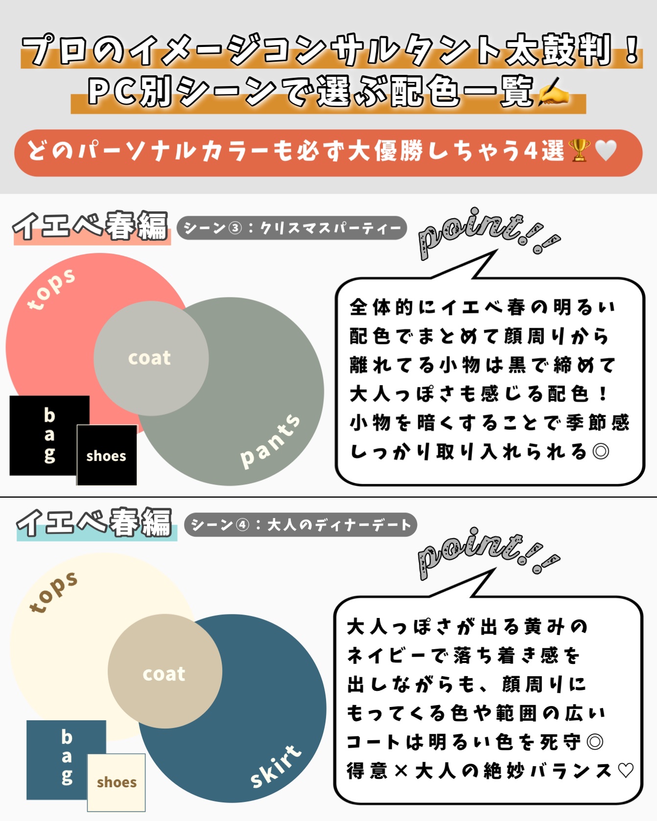 💛イエベ春💛はキラキラと若々しい印象のグループです!明るく華やかさがありそんな素敵なところを生かせる配色を紹介いたしました😊✨️ ぜひ保存して参考にしてみてくださると嬉しいです😍🫶🏻 長野駅周辺で16タイプ・パーソナルカラー診断ができます🌈