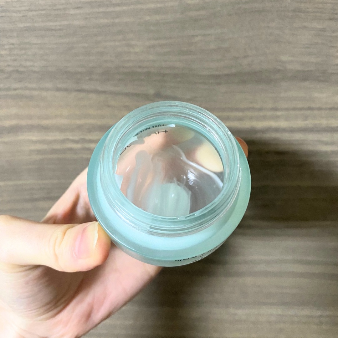 ヨモギシカの肌荒れ鎮静成分入りということで、最近あご辺りに肌荒れがちょうどあったので使ってみました。 中蓋をあけると、ふわっと香るヨモギシカの香り。爽やかな香りです。 ジェルっぽいクリームがヒヤッと気持ちいいです。スルスルのびて瑞々しいテクスチャーでした。
