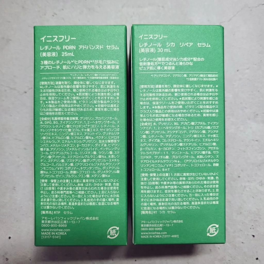 イニスフリーで大人気の「レチノール シカ リペアセラム」と最近新発売された話題の「レチノール PDRN アドバンスドセラム」! 水の代わりに56%の緑茶乳酸菌由来のグリーンティーPDRN™︎配合!韓国ヴィーガン認証院にてヴィーガン認証取得。 レチノール初心者さんや、詰まり毛穴が気になる人、毛穴ケアしたい人には「レチノール シカ リペアセラム」がいいと思います♪