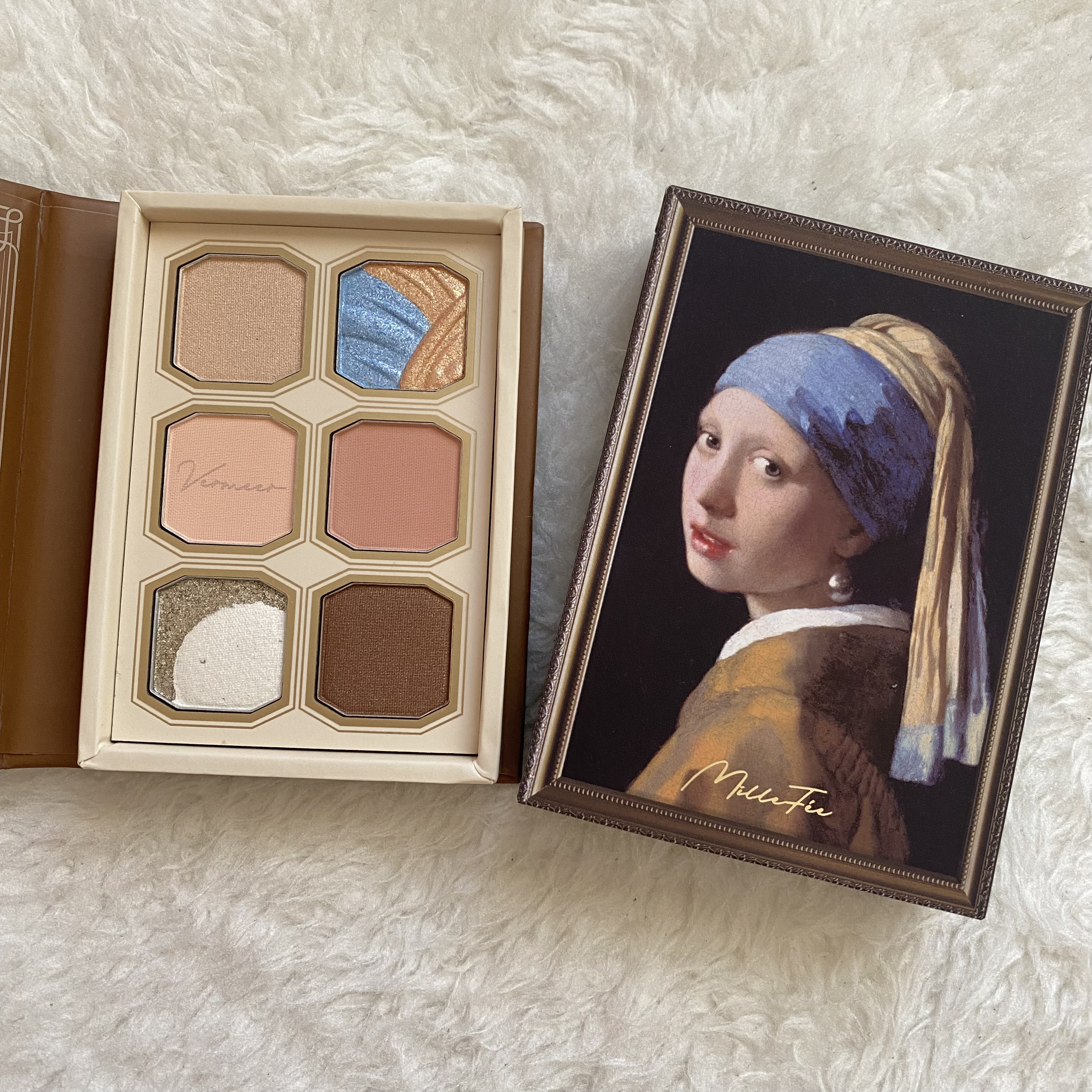 柔らかい色味と真珠やドレープのデザインが印象的なパレット。 絵画の世界観が忠実に表現されてて眼福🥹 特に左上のパール見てほしい!この光り方、まさに真珠じゃない!?💫 使いやすいかつオシャレなパレット。 絵画アイシャドウパレットはカラバリも豊富なのでお気に入りの色味が見つかるはず!