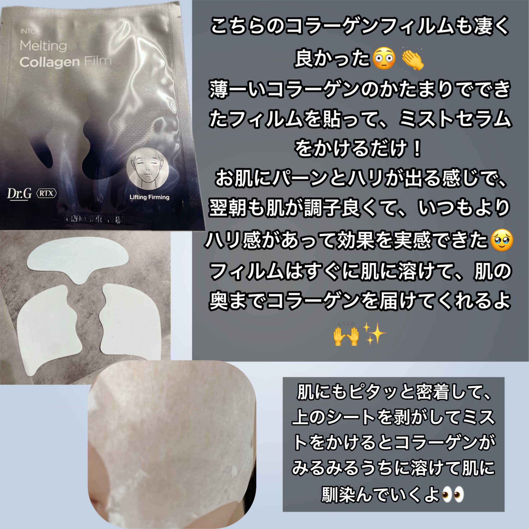 ブラックスネイル配合で、肌にしっかり栄養を与えてくれるよ!ゼリー状なのに吹きかけるときめ細かいミストに😳✨ 溶けてえるコラーゲンライルム😳✨ フィルム自体がコラーゲンのかたまりになっていて、洗顔後RTXセラムを塗った後に、コラーゲンフィルムを肌に貼り、ミストセラムをふりかけて使用するよ! ミストを吹きかけるとすーっとお肌に溶け込んで不思議な感覚✨ 手のひらに吸い付くようなもっちり感でハリも感じられて◎👌✨