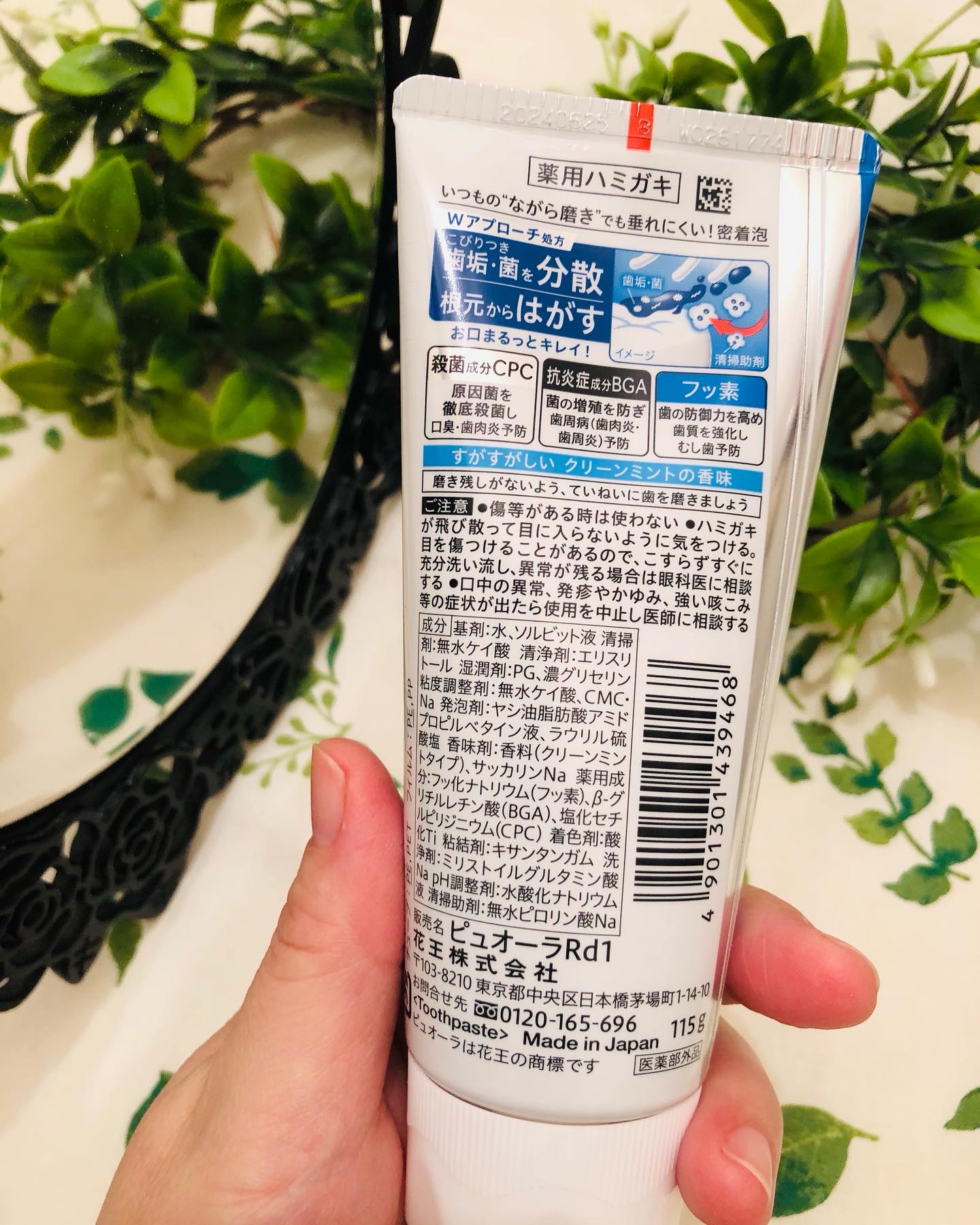 - <クリーンミント 115g><クリーンミント 大容量 170g> 基剤:水、ソルビット液 清掃剤:無水ケイ酸 清浄剤:エリスリトール 湿潤剤:PG、濃グリセリン 粘度調整剤:無水ケイ酸、CMC・Na 発泡剤:ヤシ油脂肪酸アミドプロピルベタイン液、ラウリル硫酸塩 香味剤:香料(クリーンミントタイプ)、サッカリンNa 薬用成分:フッ化ナトリウム(フッ素)、β-グリチルレチン酸(BGA)、塩化セチルピリジニウム(CPC) 着色剤:酸化Ti 粘結剤:キサンタンガム 洗浄剤:ミリストイルグルタミン酸Na pH調整剤:水酸化ナトリウム液 清掃助剤:無水ピロリン酸Na <ストロングミント 115g><ストロングミント 大容量 170g> 基剤:水、ソルビット液 清掃剤:無水ケイ酸 清浄剤:エリスリトール 湿潤剤:PG、濃グリセリン 粘度調整剤:無水ケイ酸、CMC・Na 発泡剤:ヤシ油脂肪酸アミドプロピルベタイン液、ラウリル硫酸塩 香味剤:香料(ストロングミントタイプ)、サッカリンNa 薬用成分:フッ化ナトリウム(フッ素)、β-グリチルレチン酸(BGA)、塩化セチルピリジニウム(CPC) 着色剤:酸化Ti 粘結剤:キサンタンガム 洗浄剤:ミリストイルグルタミン酸Na pH調整剤:水酸化ナトリウム液 清掃助剤:無水ピロリン酸Na <フレッシュカシス 115g><フレッシュカシス 大容量 170g> 基剤:水、ソルビット液 清掃剤:無水ケイ酸 清浄剤:エリスリトール 湿潤剤:PG、濃グリセリン 粘度調整剤:無水ケイ酸、CMC・Na 発泡剤:ヤシ油脂肪酸アミドプロピルベタイン液、ラウリル硫酸塩 香味剤:香料(フレッシュカシスタイプ)、サッカリンNa 薬用成分:フッ化ナトリウム(フッ素)、β-グリチルレチン酸(BGA)、塩化セチルピリジニウム(CPC) 着色剤:酸化Ti 粘結剤:キサンタンガム 洗浄剤:ミリストイルグルタミン酸Na pH調整剤:水酸化ナトリウム液 清掃助剤:無水ピロリン酸Na