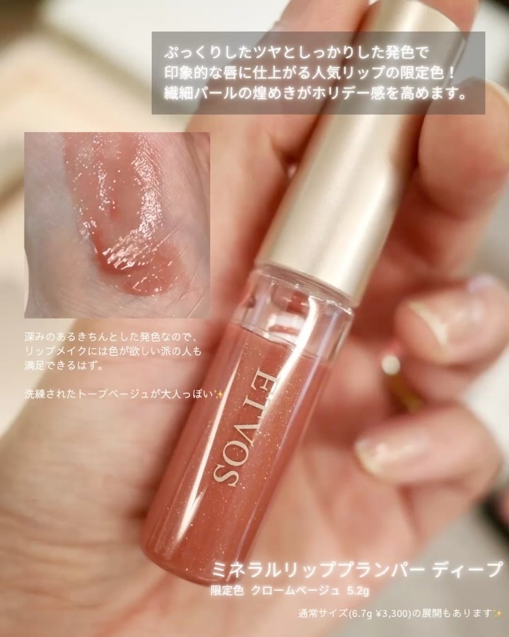 ついにETVOSのコフレが発売✨ 昨年も話題になったコフレボックスに、今年はアイシャドウ・化粧下地・フェイスパウダー・リップの4点が入っています。 アイシャドウは流行りのミュートメイクができるやわらかくてパールがきれいな配色♪右上のゴールドがまた華やかなんです。 リップ!私実はこれが1番推しかも🤭 クロームベージュのカラーがめちゃめちゃかわいいし使いやすい!
