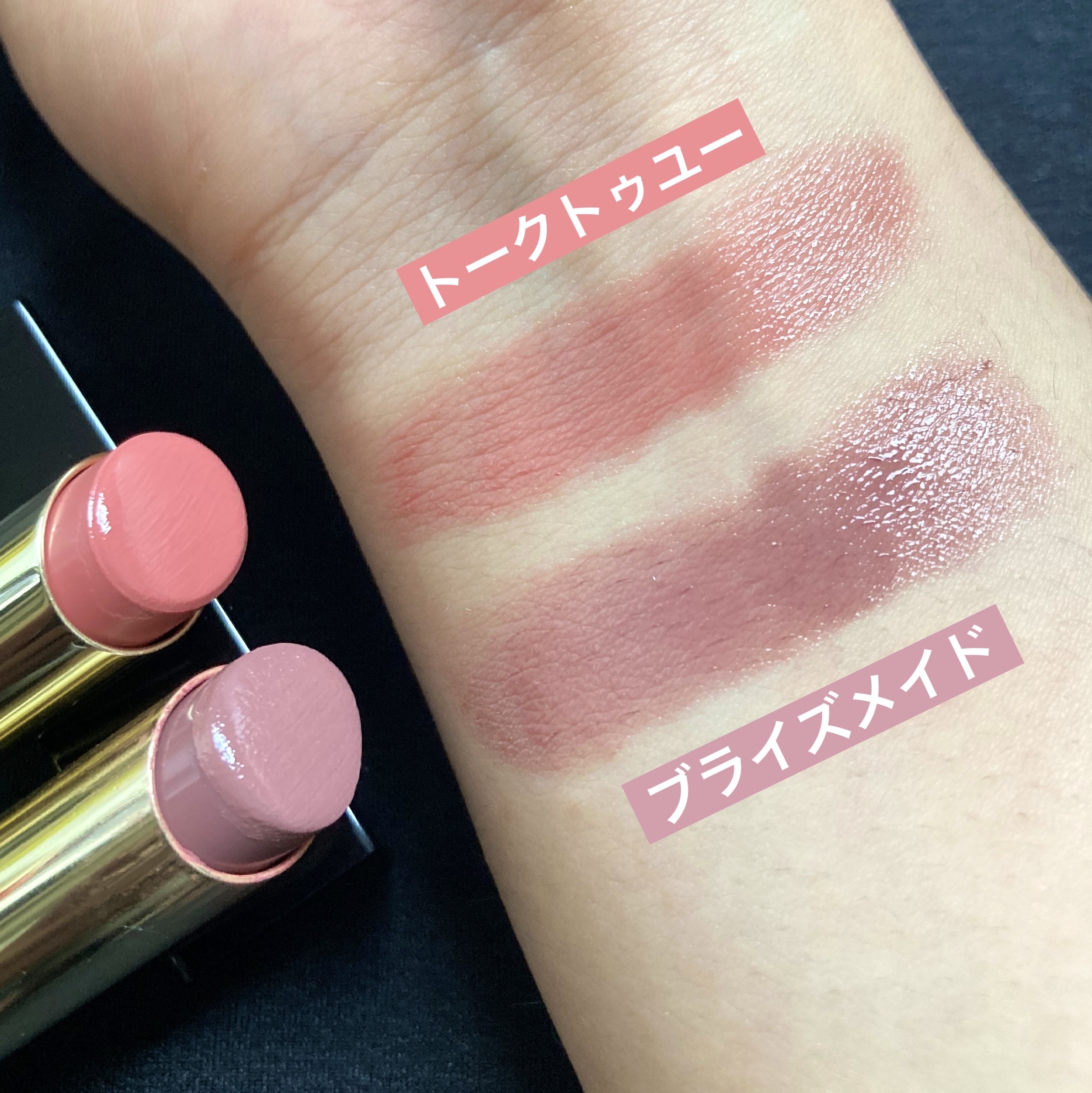 やや硬さが有りながらも、とろりと滑らかに 塗布しやすいリップ とろり塗りはスティックと近い発色となり 素の唇ながら、しっかりと色も感じる仕上がり どちらの塗り方でもシアー感が有り素の唇から 離れ過ぎず浮かない仕上がり