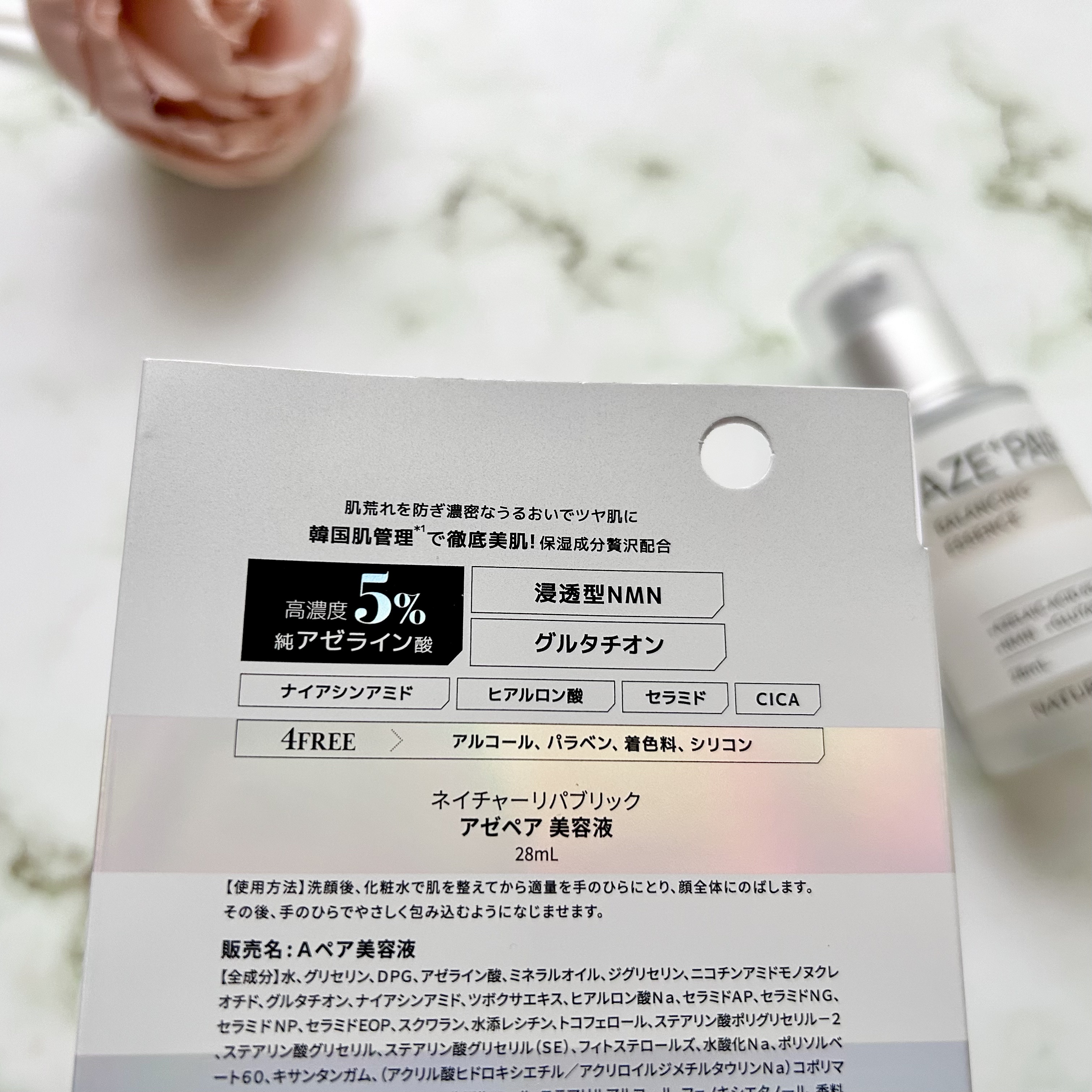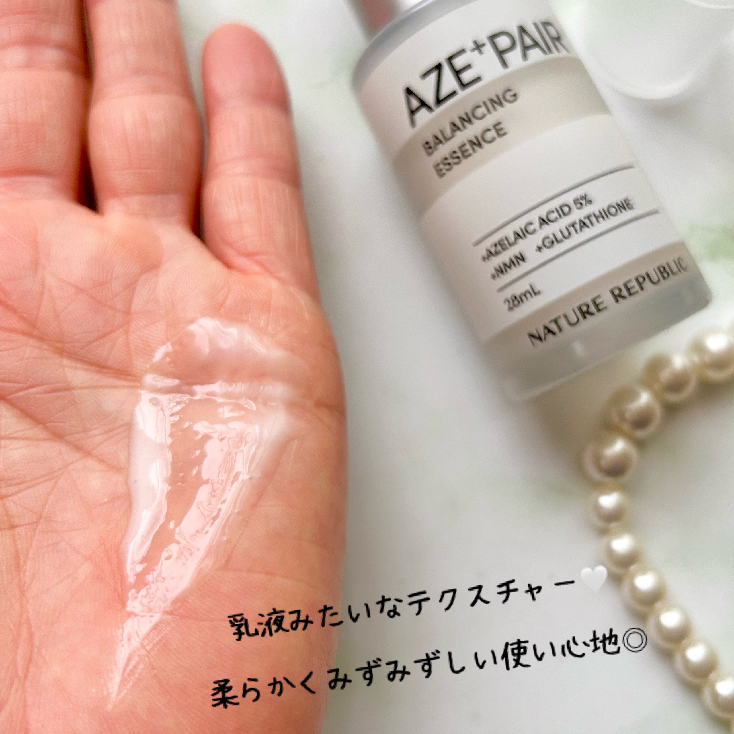 - 【韓国の肌管理*から発想を得たアゼペア】 高濃度*1の純アゼライン酸*2と厳選した美容成分が皮脂トラブル*3や肌荒れをしっかり防ぎながらも毛穴*4をケアして透明感*5のある肌へと整えます。 美容液には純アゼライン酸*2を5%配合しており、ミルクタイプのエッセンスが濃密なうるおいを素肌に届けます。普段のスキンケアにプラスするだけで皮脂トラブル*3をケアし、肌荒れを防ぎます。 先行発売:2024年8月31日よりロフト、PLAZA・MINiPLA、公式オンラインストアにて先行発売。 *うるおいケアのこと*1当社比*2保湿成分*3過剰な皮脂の分泌による肌荒れのこと*4乾燥によって開いた毛穴のこと*5うるおいを与えることによる肌印象のこと