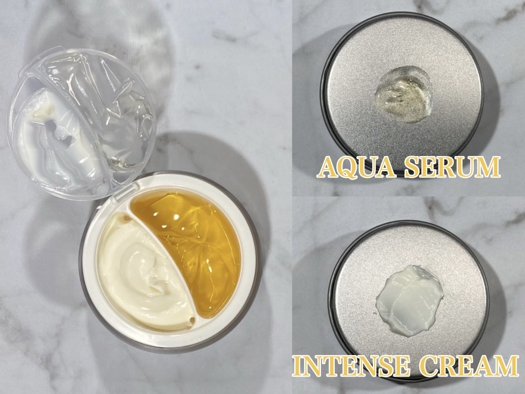 - アクサセラムとインテンスクリームのデュアル・フォーミュラで肌のタイプやコンディションに合わせて 比率を調節してカスタマイズ・ケアします。 ・アクアセラム:ヒアルロン酸、パンテノール、ツボクサエキス*が含まれた、さっぱりとした使用感で肌に水分を与え肌のキメを整えます。*ヒアルロン酸・パンテノール・ツボクサエキス(いずれも保湿成分) ・インテンスクリーム:イタリア産ホワイトトリュフ*が含まれた、もっちりした使用感で肌にうるおいを与えツヤのあるもち肌へ導きます。*ツベルマグナツムエキス(保湿成分) イタリアヴィーガン認証V-LABEL取得 皮膚低刺激テスト済み *全ての方に皮膚刺激が発生しないということではありません。 【使い方】 1. 洗顔後、スパチュラで肌のコンディションによって、セーラムとクリームを適量を取り、 ミックスしてから顔全体に優しく塗り広げ、 吸収させます。※ 必要に応じて、アクアセラムとインテンスクリームは単品でも使用できます。 【使用上の注意】 お肌に異常が生じていないかよく注意して使用してください。化粧品がお肌に合わないとき即ち次のような場合には、使用を中止してください。そのまま使用を続けますと、症状を悪化させることがありますので、皮ふ科専門医等にご相談されることをおすすめします。 (1)使用中、赤味、はれ、かゆみ、刺激、色抜け(白斑等)や黒ずみ等の異常があらわれた場合 (2)使用したお肌に、直射日光があたって(1)のような異常があらわれた場合