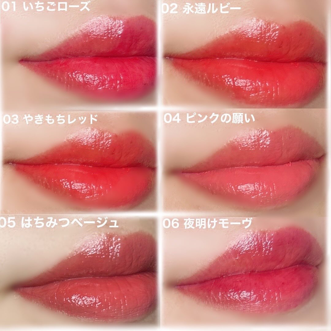 - ・じゅわっと透明感*¹ ある美発色 ティントでありながらも自然なリップカラーを演出。 見たまま美発色で唇を彩り、グロウなテクスチャーでありながらカラーフィクシングが可能。 ・ひと塗りでボリューム感*¹ と、とろける光沢感を演出 独自成分*² により反射光を効果的に演出し、唇の皺を見えにくくする。 また、モイスチャー感と光沢感もキープし、生ツヤっぽい光沢感を演出。 ・クリアなレイヤリングカラー 厚みのない、塗れば塗るほどきれいな発色。 ヌーディ系のライトとミュートカラー展開。 *¹ メイクアップ効果 *² アルミナ成分