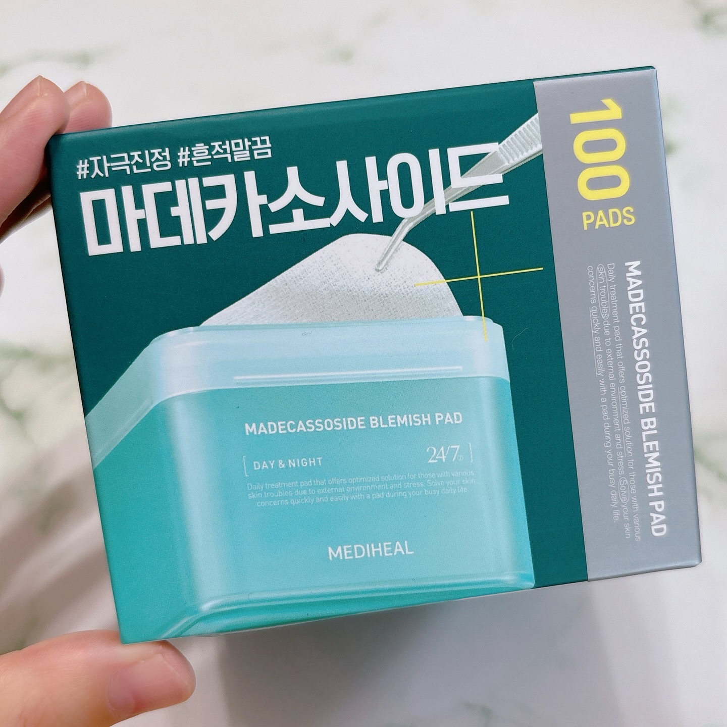 マデカソサイド(ツボクサ2回抽出)+ナイアシンアミド成分配合のパッドになります。 たっぷり100枚入っており朝晩使えるので嬉しいです。 肌荒れ防止ケアエッセンスをたっぷり含んだカーゼ素材のパッドでピタッと密着してくれるのでそこもオススメポイントですよ。