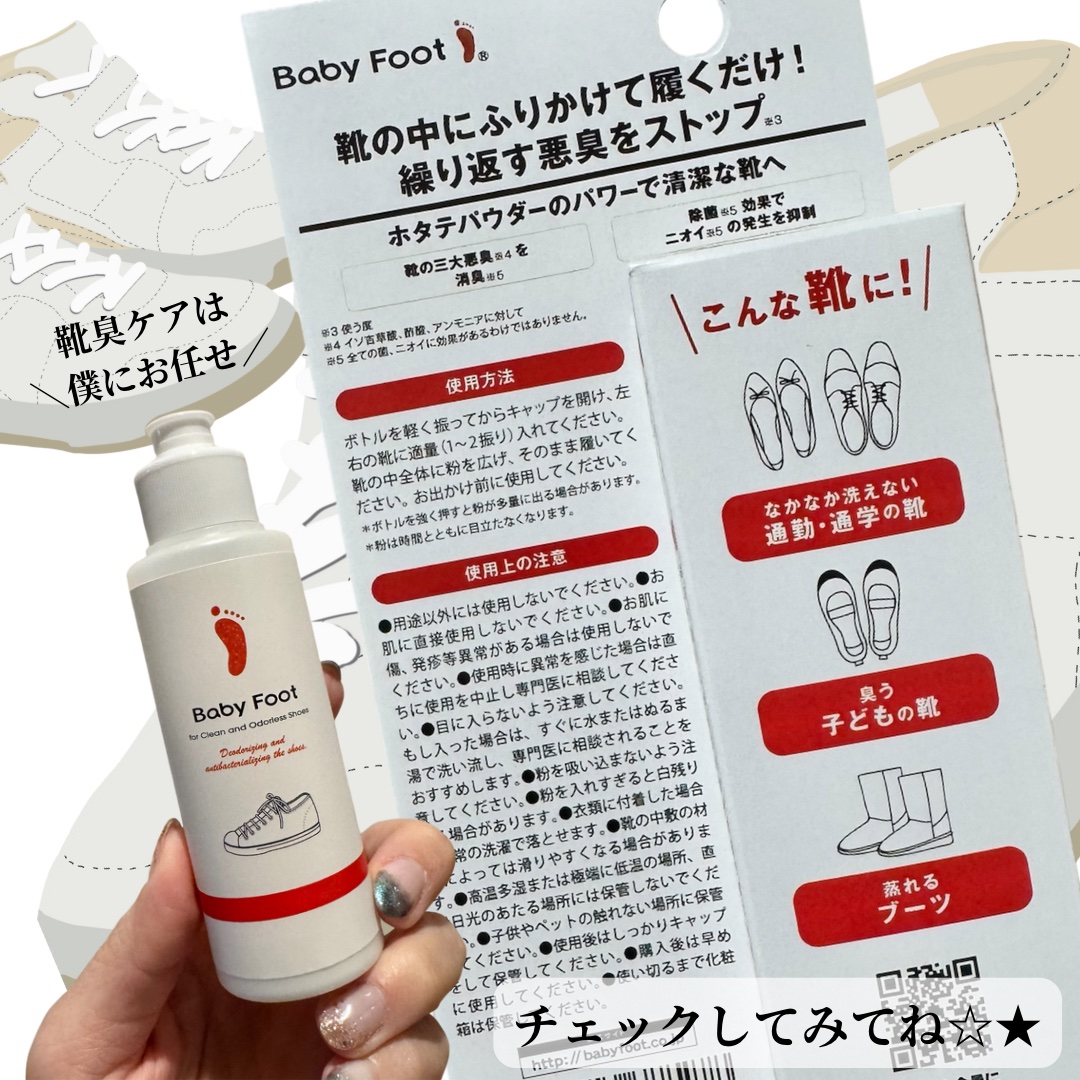 靴消臭パウダーをいただきました🕊️𓂃𓈒𓏸 ベビーフット様といえば足の健康を考えたアイテムが多いブランド様🦶 靴の最大悪臭であるイソ吉草酸・酢酸・アンモニアに働きかけ靴を無臭化👟 気が付かないうちにケアできるって良いなって大絶賛していました😊