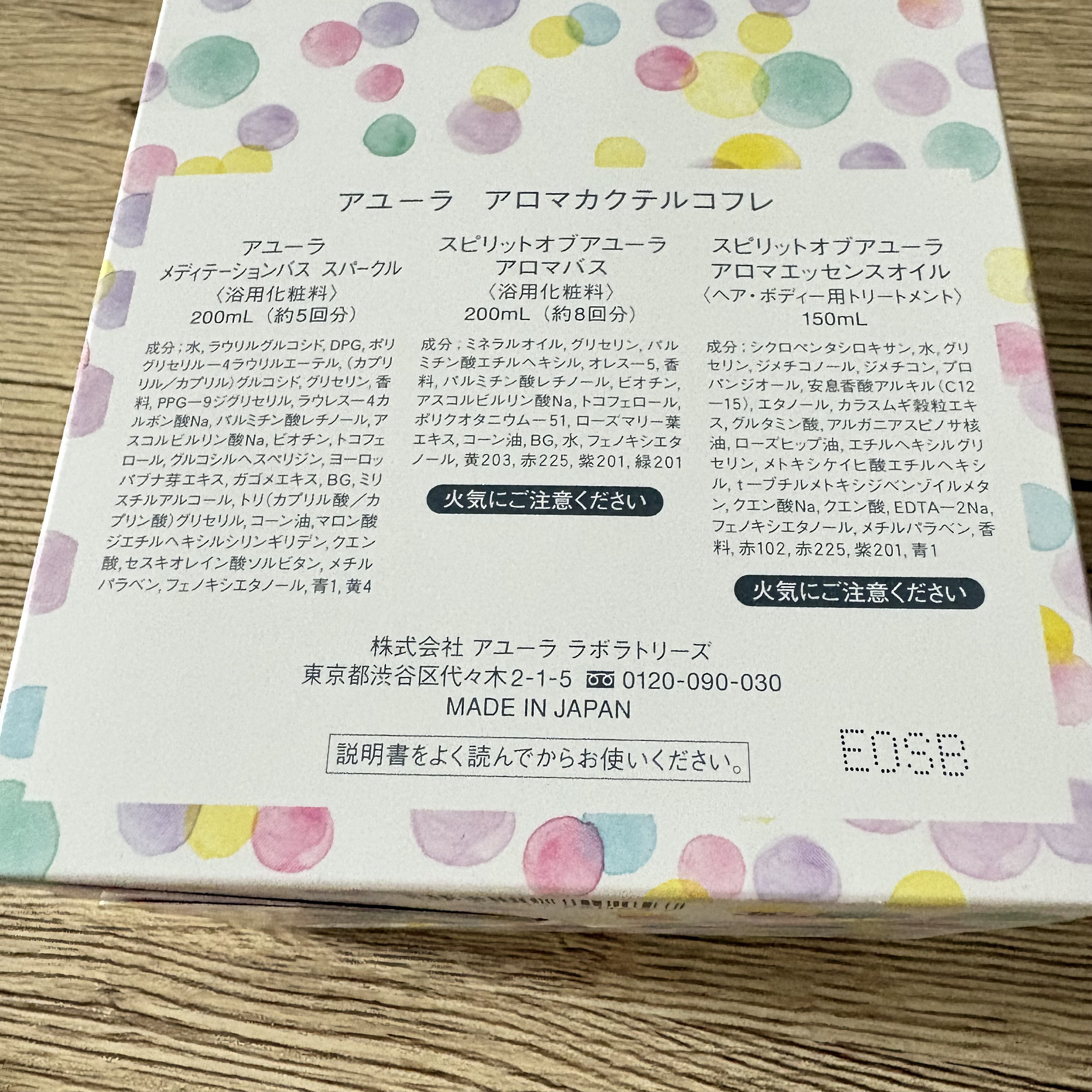 - 数量限定発売 2019年11月に限定発売され、再販希望のお声を多くいただいた「アユーラ アロマカクテルコフレ」を復刻。 入浴料2 種とヘア&ボディ用オイルがセットになったバス&ボディケアコフレです。 アユーラ1番人気の入浴料・メディテーションバスtの香りのバブルバス「メディテーションバス スパークル」、鮮やかな色とフローラルグリーンの清らかな香りにときめく保湿入浴料「スピリットオブアユーラ アロマバス」、エッセンス&オイルのWトリートメント効果のヘア・ボディ用エッセンスオイル「スピリットオブアユーラ アロマエッセンスオイル」、3品全てコフレ限定のアイテムです。 バスタイムもアフターバスも、安らぐ香りに包まれながら、贅沢保湿で特別なひとときをお過ごしください。 <内容> ・アユーラ メディテーションバス スパークル 200mL<限定品> ・スピリットオブアユーラ アロマバス 200mL<限定品> ・スピリットオブアユーラ アロマエッセンスオイル 150mL<限定品>
