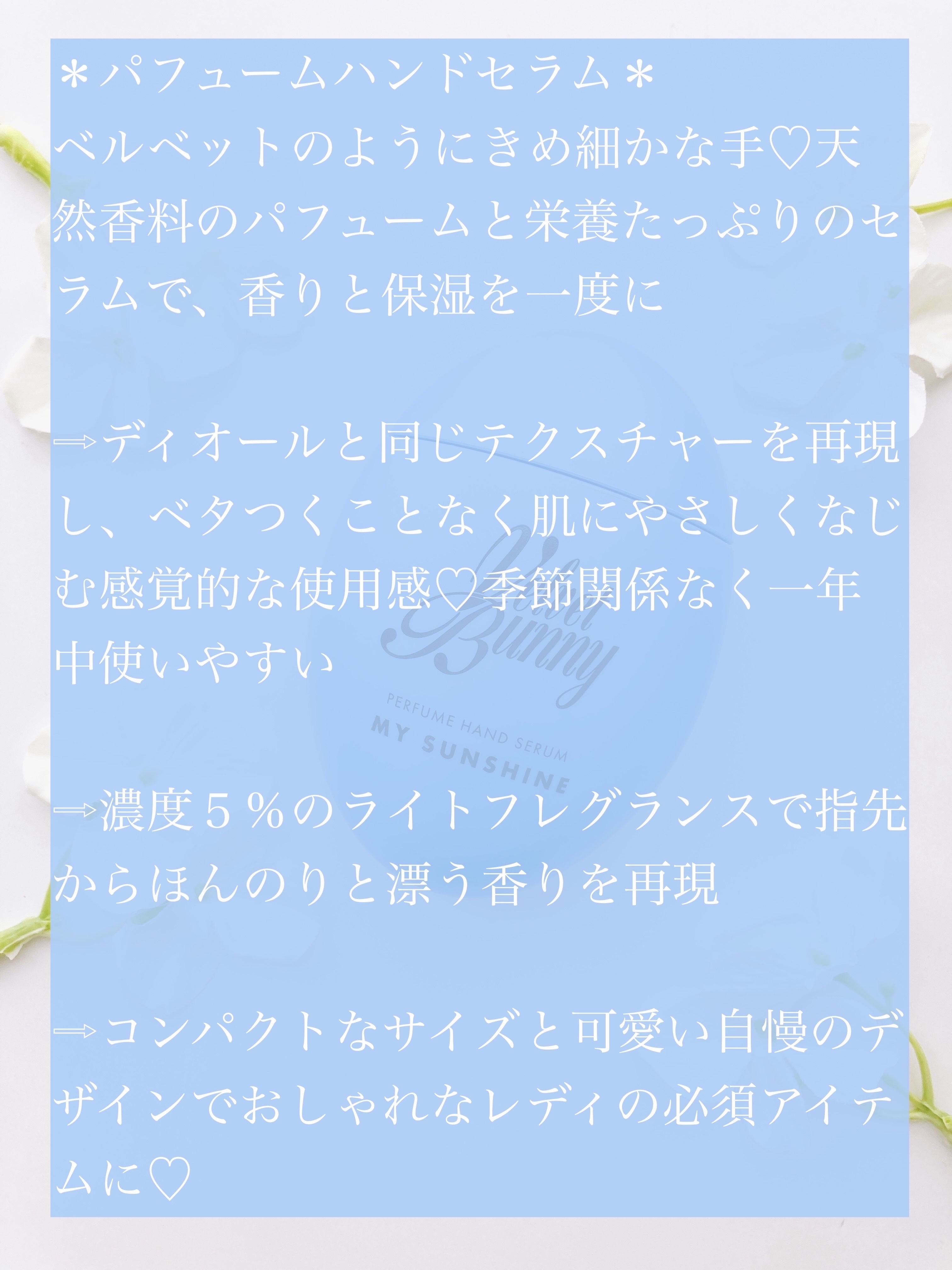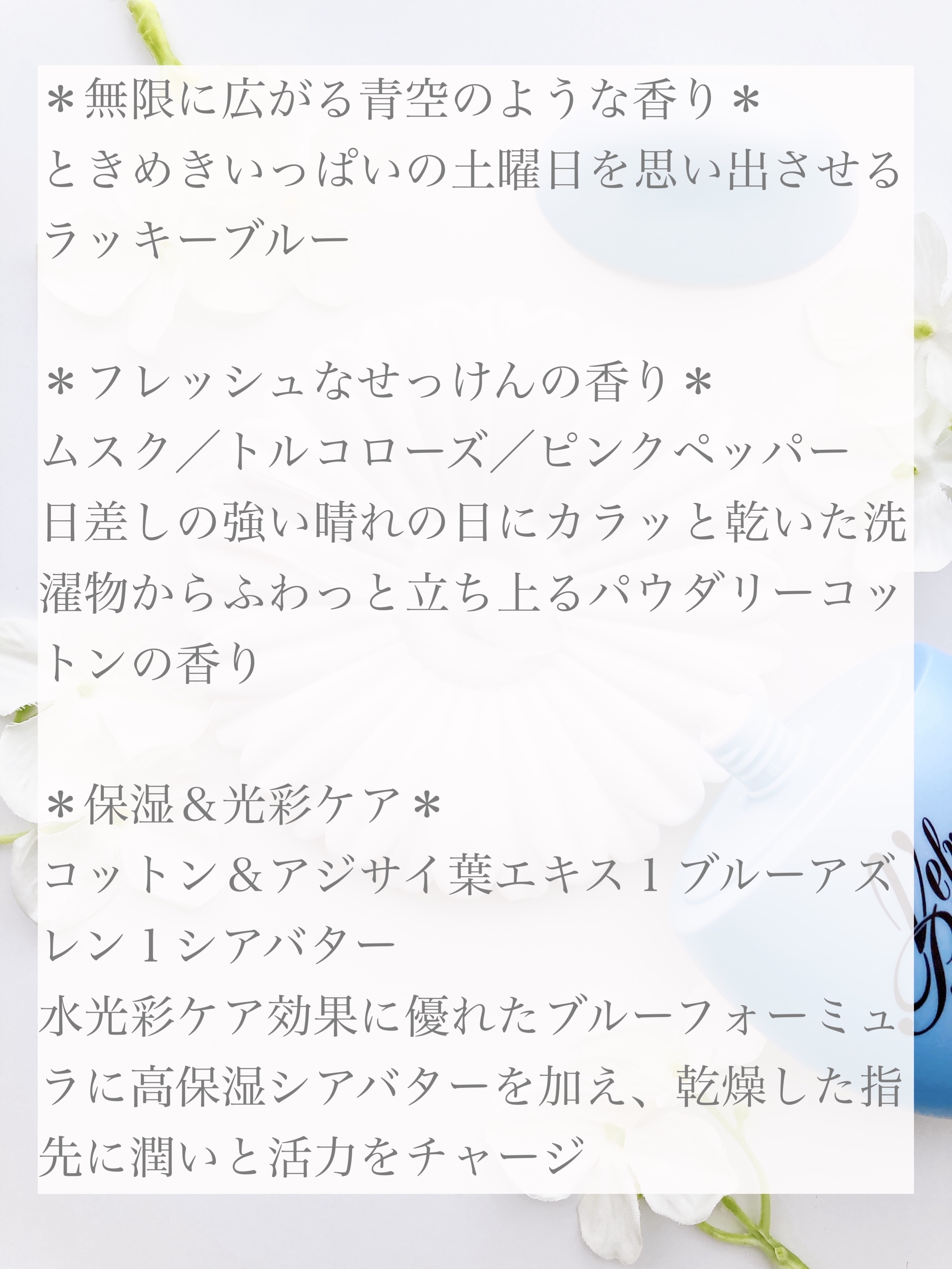 - オールシーズン高保湿パフュームハンドクリーム 天然香料のパフュームと潤いたっぷりのセラムで香りと保湿を一度に! MY SUNSHINE - Be Colored with Blue 無限に広がる青空のような香り ときめきいっぱいの土曜日を思い出させるラッキーブルー ◆NOTE:フレッシュなせっけんの香りムスク・トルコローズ・ピンクペッパー 日差しの強い晴れの日にカラッと乾いた洗濯物から ふわっと立ち上るパウダリーコットンの香り ◆NUTRITION:保湿&光彩ケア コットン&アジサイ葉エキス・ブルーアズレン ・シアバター(全て保湿成分) 水光彩(艶)ケア効果の高いブルーフォーミュラに高保湿シアバターを加え、 乾燥した指先に潤いと艶をチャージします ◆TEXTURE:洗練されたベルベットテクスチャ べたつかず柔らかくすべすべに!オールシーズンハンドクリーム保湿のコーティング膜で、長時間サラッと感を保ちます