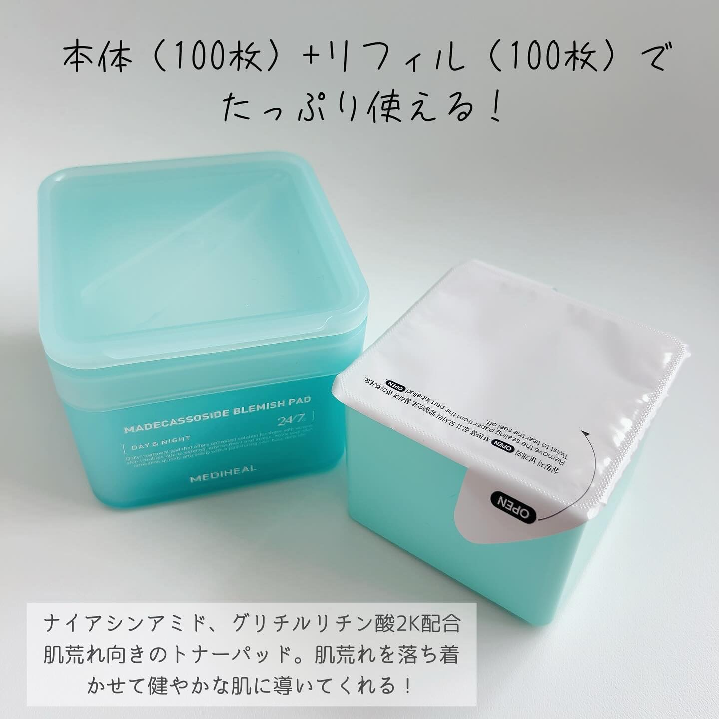 - <100枚入> 水、DPG、グリセレス-26、ナイアシンアミド、グリセリン、1,2-ヘキサンジオール、ジフェニルジメチコン、トリエチルヘキサノイン、ヒドロキシアセトフェノン、水添レシチン、オレイン酸ポリグリセリル-10、ツボクサエキス、アラントイン、グリチルリチン酸2K、オクチルドデセス-16、クエン酸Na、クエン酸、ラウリン酸ポリグリセリル-10、EDTA-2Na、エンピツビャクシン油、BG、オウシュウヨモギ油、パチョリ油、マデカッソシド、ローズマリー葉油、ニオイスミレ葉エキス、ツボクサ葉エキス、サッカロミセス培養物、ツボクサ根エキス、マンゴー果実エキス、乳酸桿菌発酵液、アシアチコシド、マデカシン酸、アシアチン酸 <100枚入(170ml)+ティーツリートナーパッド 10枚入(20ml) > 水、DPG、グリセレス-26、ナイアシンアミド、グリセリン、1,2-ヘキサンジオール、ジフェニルジメチコン、トリエチルヘキサノイン、ヒドロキシアセトフェノン、水添レシチン、オレイン酸ポリグリセリル-10、ツボクサエキス、アラントイン、グリチルリチン酸2K、オクチルドデセス-16、クエン酸Na、クエン酸、ラウリン酸ポリグリセリル-10、EDTA-2Na、エンピツビャクシン油、BG、オウシュウヨモギ油、パチョリ油、マデカッソシド、ローズマリー葉油、ニオイスミレ葉エキス、ツボクサ葉エキス、サッカロミセス培養物、ツボクサ根エキス、マンゴー果実エキス、乳酸桿菌発酵液、アシアチコシド、マデカシン酸、アシアチン酸 <100枚入(170ml)+コラーゲンパッド 10枚入(20ml) > 水、DPG、グリセレス-26、ナイアシンアミド、グリセリン、1,2-ヘキサンジオール、ジフェニルジメチコン、トリエチルヘキサノイン、ヒドロキシアセトフェノン、水添レシチン、オレイン酸ポリグリセリル-10、ツボクサエキス、アラントイン、グリチルリチン酸2K、オクチルドデセス-16、クエン酸Na、クエン酸、ラウリン酸ポリグリセリル-10、EDTA-2Na、エンピツビャクシン油、BG、オウシュウヨモギ油、パチョリ油、マデカッソシド、ローズマリー葉油、ニオイスミレ葉エキス、ツボクサ葉エキス、サッカロミセス培養物、ツボクサ根エキス、マンゴー果実エキス、乳酸桿菌発酵液、アシアチコシド、マデカシン酸、アシアチン酸 <100枚入(170ml)+PDRN パッド 10枚入(20ml) > 水、DPG、グリセレス-26、ナイアシンアミド、グリセリン、1,2-ヘキサンジオール、ジフェニルジメチコン、トリエチルヘキサノイン、ヒドロキシアセトフェノン、水添レシチン、オレイン酸ポリグリセリル-10、ツボクサエキス、アラントイン、グリチルリチン酸2K、オクチルドデセス-16、クエン酸Na、クエン酸、ラウリン酸ポリグリセリル-10、EDTA-2Na、エンピツビャクシン油、BG、オウシュウヨモギ油、パチョリ油、マデカッソシド、ローズマリー葉油、ニオイスミレ葉エキス、ツボクサ葉エキス、サッカロミセス培養物、ツボクサ根エキス、マンゴー果実エキス、乳酸桿菌発酵液、アシアチコシド、マデカシン酸、アシアチン酸
