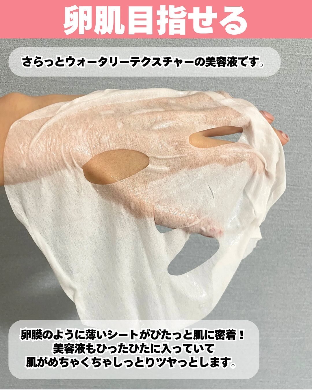 卵殻膜が入っていて、剥いた卵のようになめらかでプルンプルンな肌に仕上げるプレミアムホームケアマスク♪ 美容液が贅沢にヒタヒタに入っているのでこぼれないように注意です♪ べたつきにくくメイク前にも使いやすい仕上がりでした!