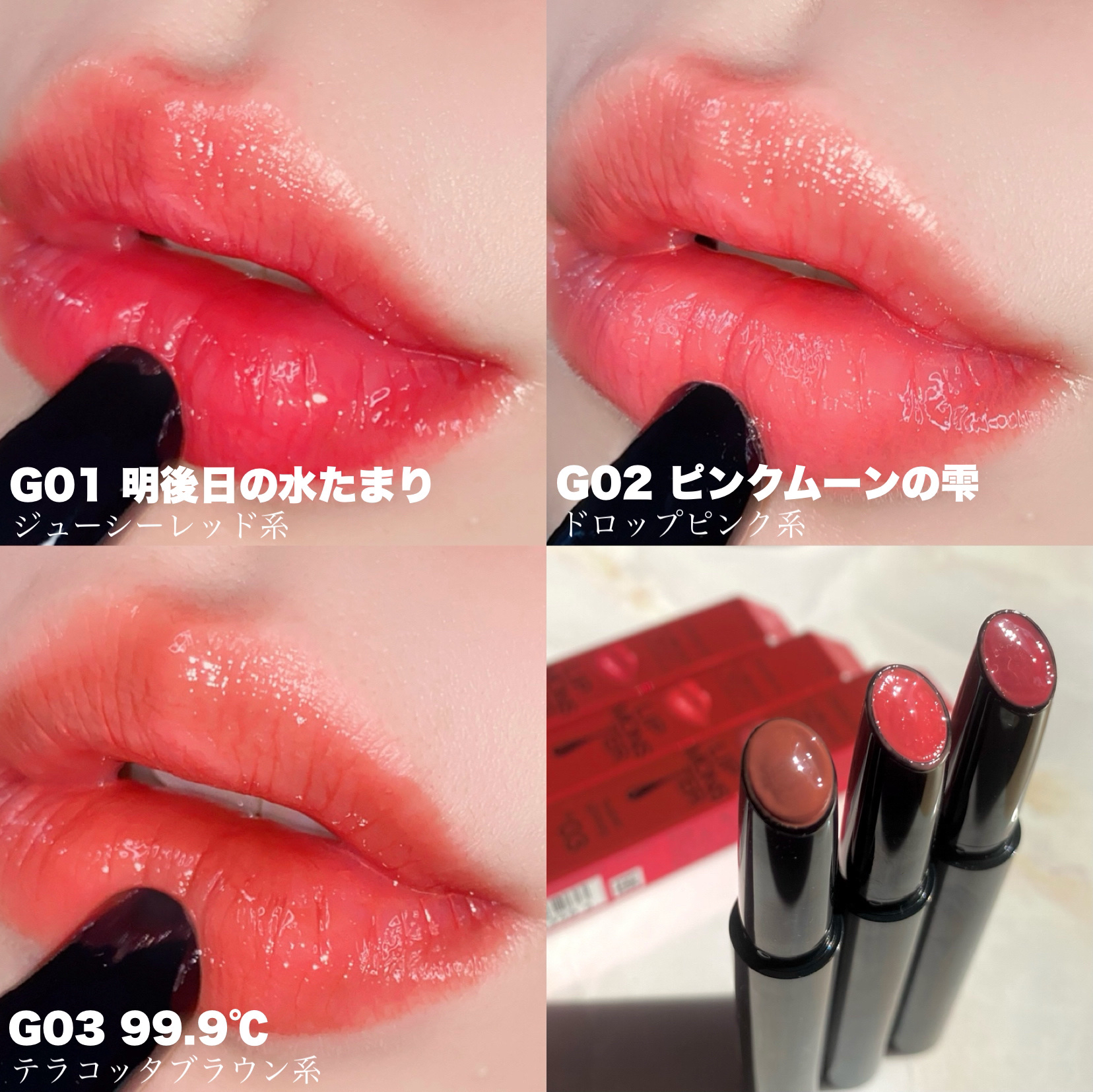 ひとぬりでとろけてツヤがあふれだす リップモンスターツヤバース。唇から蒸発する水分を活用してとろツヤジェル膜に変化する独自技術で、落ちにくい。 トロトロなのに唇に乗せると嫌なベタつきはなくてムラにもならずにスルスル伸び広がってかつしっかりカラー感も楽しめる濃密な発色♡ これは艶リップ好きさん試してみて欲しい! もし一色しか選べないとしたら私の推しはG02 ピンクムーンの雫♡