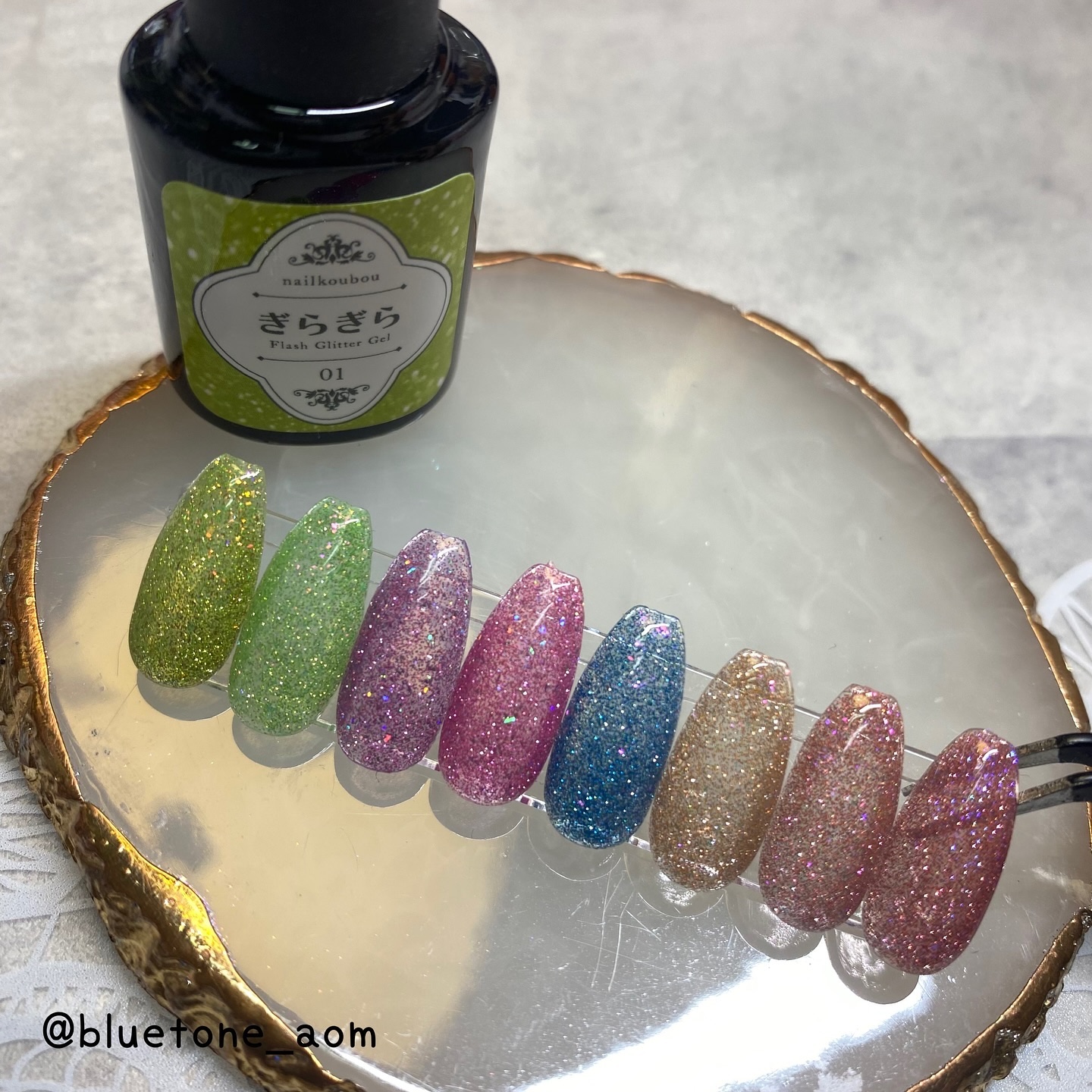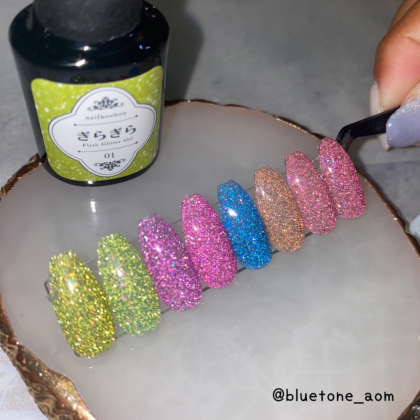 ラメがしっかりしてるし クリアカラーが入ってるから オーロラパウダー無しでも 充分キラキラしました! 反射強めのフィルムなので 実物はもっと うるうるとキラキラが強いです! ビー玉みたい🥺 ネイルシール長持ちさせたいけど ちょっと飽きてきたな〜って時とかに 全然違った印象になるのでオススメです! Seriaのベースジェル 本当にうるうるネイルしやすいので オススメしたい🙆♀️