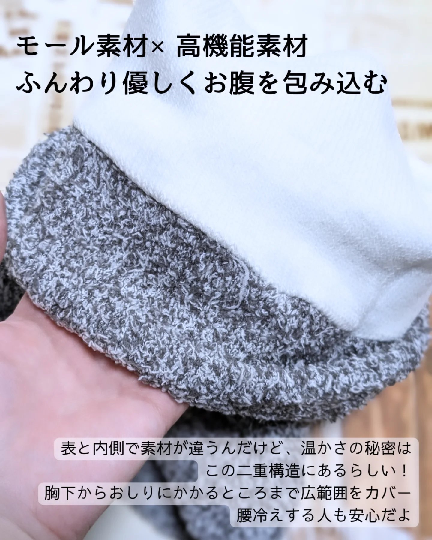 こちらは遠赤外線やモール素材などのこだわりで着用すると大変温かく感じるインナーです( 💓∀💓) こちらのアイテムはその辺のもこもこアイテムよりも遙か上を行ってる、レベチなアイテム(*´ω`*) ソックスは長さがあるしつま先までも暖かく、締め付けもキツくないですしハラマキも締め付け感が強くないのにしっかり包容感があるためさらに暖かく感じられました!