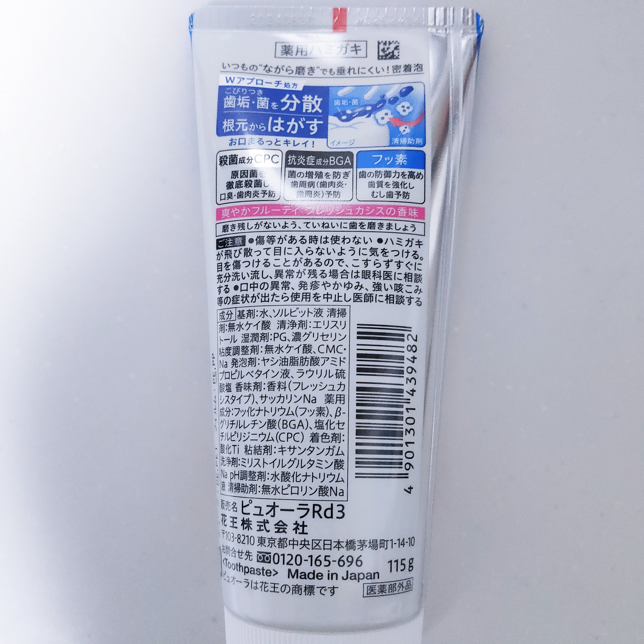 - <クリーンミント 115g><クリーンミント 大容量 170g> 基剤:水、ソルビット液 清掃剤:無水ケイ酸 清浄剤:エリスリトール 湿潤剤:PG、濃グリセリン 粘度調整剤:無水ケイ酸、CMC・Na 発泡剤:ヤシ油脂肪酸アミドプロピルベタイン液、ラウリル硫酸塩 香味剤:香料(クリーンミントタイプ)、サッカリンNa 薬用成分:フッ化ナトリウム(フッ素)、β-グリチルレチン酸(BGA)、塩化セチルピリジニウム(CPC) 着色剤:酸化Ti 粘結剤:キサンタンガム 洗浄剤:ミリストイルグルタミン酸Na pH調整剤:水酸化ナトリウム液 清掃助剤:無水ピロリン酸Na <ストロングミント 115g><ストロングミント 大容量 170g> 基剤:水、ソルビット液 清掃剤:無水ケイ酸 清浄剤:エリスリトール 湿潤剤:PG、濃グリセリン 粘度調整剤:無水ケイ酸、CMC・Na 発泡剤:ヤシ油脂肪酸アミドプロピルベタイン液、ラウリル硫酸塩 香味剤:香料(ストロングミントタイプ)、サッカリンNa 薬用成分:フッ化ナトリウム(フッ素)、β-グリチルレチン酸(BGA)、塩化セチルピリジニウム(CPC) 着色剤:酸化Ti 粘結剤:キサンタンガム 洗浄剤:ミリストイルグルタミン酸Na pH調整剤:水酸化ナトリウム液 清掃助剤:無水ピロリン酸Na <フレッシュカシス 115g><フレッシュカシス 大容量 170g> 基剤:水、ソルビット液 清掃剤:無水ケイ酸 清浄剤:エリスリトール 湿潤剤:PG、濃グリセリン 粘度調整剤:無水ケイ酸、CMC・Na 発泡剤:ヤシ油脂肪酸アミドプロピルベタイン液、ラウリル硫酸塩 香味剤:香料(フレッシュカシスタイプ)、サッカリンNa 薬用成分:フッ化ナトリウム(フッ素)、β-グリチルレチン酸(BGA)、塩化セチルピリジニウム(CPC) 着色剤:酸化Ti 粘結剤:キサンタンガム 洗浄剤:ミリストイルグルタミン酸Na pH調整剤:水酸化ナトリウム液 清掃助剤:無水ピロリン酸Na