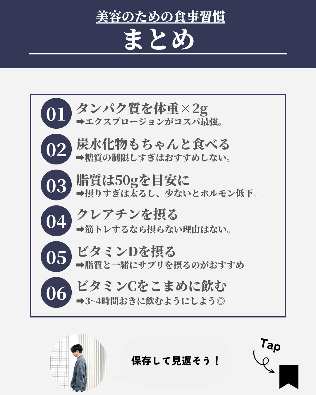 あなたはやっよかった食事習慣はありますか?? 今回は僕が今もほぼ毎日継続してる食事の習慣を6つ紹介します!! この習慣を継続するようになってから、 肌荒れもグッと減ったし、ガリガリから理想の体に近づいた◎ 食事で体の内側からケアを続けるとコンディションも良くなるし、 是非やってほしい!! 僕が普段使ってるその他のおすすめアイテムはプロフィールのリンクから 楽天RoomとAmazonストアフロントにまとめています🙌 気になるからは覗いてみてください! これからも一緒に清潔感を上げてカッコよくなりましょう🔥 ーーーーーーーーーーーーーーーーーーーーーーーー このアカウントでは、 メンズ美容でモテ力UPした工場勤務の25歳の僕が あなたが、1.5倍カッコ良くなるメンズケアを発信しています。 ◻︎女子受けするメンズスキンケア