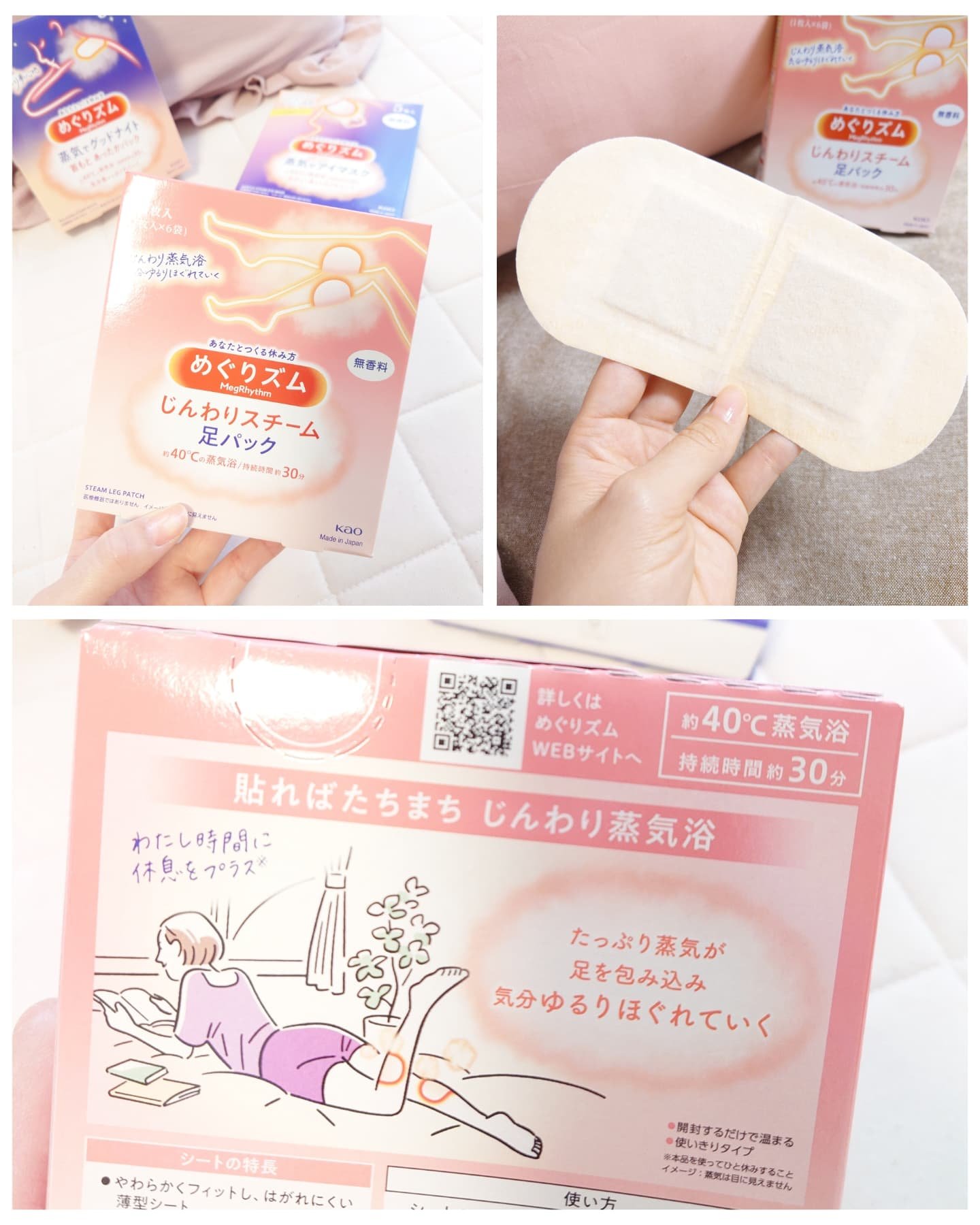 目の奥までじんわりと温まる感じが疲れがほぐれてる感じですごく好き♡ サイズと男女兼用だから夫婦で使えるのも嬉しい✨️ シートの周りに粘着シールがついていてズレずにピタッと密着する◎ ふくらはぎも温まると気持ち良いんだなと実感◎ 約30分じんわりあたためてくれるの良い♡