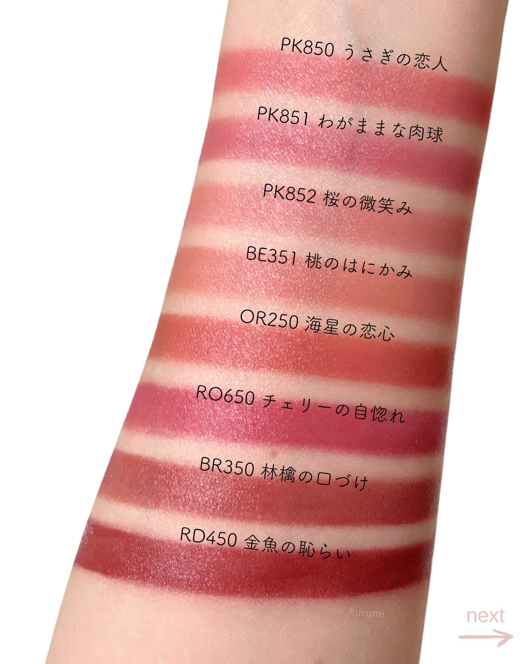 - <BE351 桃のはにかみ> ジフェニルジメチコン、デカエチルヘキサン酸ポリグリセリル-10、(VP/ヘキサデセン)コポリマー、イソドデカン、トリメチルシロキシフェニルジメチコン、テトラエチルヘキサン酸ペンタエリスリチル、トリイソステアリン酸ポリグリセリル-2、合成ワックス、ジメチコン、フェニルトリメチコン、イソステアリン酸デキストリン、DPG、トコフェロール、ヒアルロン酸Na、BHT、(エイコセン/ビニルピロリドン)コポリマー、(エチレン/プロピレン)コポリマー、カルナウバロウ、キャンデリラロウ、キャンデリラロウエステルズ、ジメチルシリル化シリカ、スクワラン、トリイソステアリン酸イソプロピルチタン、ハイドロゲンジメチコン、メチコン、水酸化Al、炭酸Ca、酸化チタン、酸化鉄、黄4、赤202 <BR350 林檎の口づけ> ジフェニルジメチコン、デカエチルヘキサン酸ポリグリセリル-10、(ビニルピロリドン/ヘキサデセン)コポリマー、イソドデカン、トリメチルシロキシフェニルジメチコン、テトラエチルヘキサン酸ペンタエリスリチル、トリイソステアリン酸ポリグリセリル-2、合成ワックス、ジメチコン、フェニルトリメチコン、イソステアリン酸デキストリン、DPG、トコフェロール、ヒアルロン酸Na、BHT、(エイコセン/ビニルピロリドン)コポリマー、(エチレン/プロピレン)コポリマー、アルミナ、カルナウバロウ、キャンデリラロウ、キャンデリラロウエステルズ、シリカ、ジメチルシリル化シリカ、スクワラン、ハイドロゲンジメチコン、炭酸Ca、酸化チタン、酸化鉄、黄4、赤202 <BR352 駆け引きワイン(限定)> ジフェニルジメチコン、デカエチルヘキサン酸ポリグリセリル-10、(VP/ヘキサデセン)コポリマー、イソドデカン、トリメチルシロキシフェニルジメチコン、テトラエチルヘキサン酸ペンタエリスリチル、合成ワックス、ジメチコン、フェニルトリメチコン、トリイソステアリン酸ポリグリセリル-2、イソステアリン酸デキストリン、DPG、トコフェロール、ヒアルロン酸Na、BHT、(エイコセン/ビニルピロリドン)コポリマー、(エチレン/プロピレン)コポリマー、アルミナ、カルナウバロウ、キャンデリラロウ、キャンデリラロウエステルズ、シリカ、ジメチルシリル化シリカ、スクワラン、ハイドロゲンジメチコン、炭酸Ca、酸化チタン、酸化鉄、黄4、赤202 <OR250 海星の恋心> ジフェニルジメチコン、デカエチルヘキサン酸ポリグリセリル-10、(ビニルピロリドン/ヘキサデセン)コポリマー、イソドデカン、トリメチルシロキシフェニルジメチコン、トリイソステアリン酸ポリグリセリル-2、テトラエチルヘキサン酸ペンタエリスリチル、合成ワックス、ジメチコン、フェニルトリメチコン、イソステアリン酸デキストリン、DPG、トコフェロール、ヒアルロン酸Na、BHT、(エイコセン/ビニルピロリドン)コポリマー、(エチレン/プロピレン)コポリマー、アルミナ、カルナウバロウ、キャンデリラロウ、キャンデリラロウエステルズ、シリカ、ジメチルシリル化シリカ、スクワラン、ハイドロゲンジメチコン、炭酸Ca、酸化チタン、酸化鉄、黄4、赤202 <PK850 うさぎの恋人> ジフェニルジメチコン、デカエチルヘキサン酸ポリグリセリル-10、(ビニルピロリドン/ヘキサデセン)コポリマー、イソドデカン、トリメチルシロキシフェニルジメチコン、テトラエチルヘキサン酸ペンタエリスリチル、トリイソステアリン酸ポリグリセリル-2、合成ワックス、ジメチコン、フェニルトリメチコン、イソステアリン酸デキストリン、DPG、トコフェロール、ヒアルロン酸Na、BHT、(エイコセン/ビニルピロリドン)コポリマー、(エチレン/プロピレン)コポリマー、アルミナ、カルナウバロウ、キャンデリラロウ、キャンデリラロウエステルズ、シリカ、ジメチルシリル化シリカ、スクワラン、ハイドロゲンジメチコン、炭酸Ca、酸化チタン、酸化鉄、黄4、赤202 <PK851 わがままな肉球> ジフェニルジメチコン、デカエチルヘキサン酸ポリグリセリル-10、(ビニルピロリドン/ヘキサデセン)コポリマー、イソドデカン、トリメチルシロキシフェニルジメチコン、テトラエチルヘキサン酸ペンタエリスリチル、トリイソステアリン酸ポリグリセリル-2、合成ワックス、ジメチコン、フェニルトリメチコン、イソステアリン酸デキストリン、DPG、トコフェロール、ヒアルロン酸Na、BHT、(エイコセン/ビニルピロリドン)コポリマー、(エチレン/プロピレン)コポリマー、アルミナ、カルナウバロウ、キャンデリラロウ、キャンデリラロウエステルズ、シリカ、ジメチルシリル化シリカ、スクワラン、ハイドロゲンジメチコン、炭酸Ca、酸化チタン、酸化鉄、黄4、赤202 <PK852 桜の微笑み> ジフェニルジメチコン、デカエチルヘキサン酸ポリグリセリル-10、(VP/ヘキサデセン)コポリマー、イソドデカン、トリメチルシロキシフェニルジメチコン、テトラエチルヘキサン酸ペンタエリスリチル、合成ワックス、トリイソステアリン酸ポリグリセリル-2、ジメチコン、フェニルトリメ