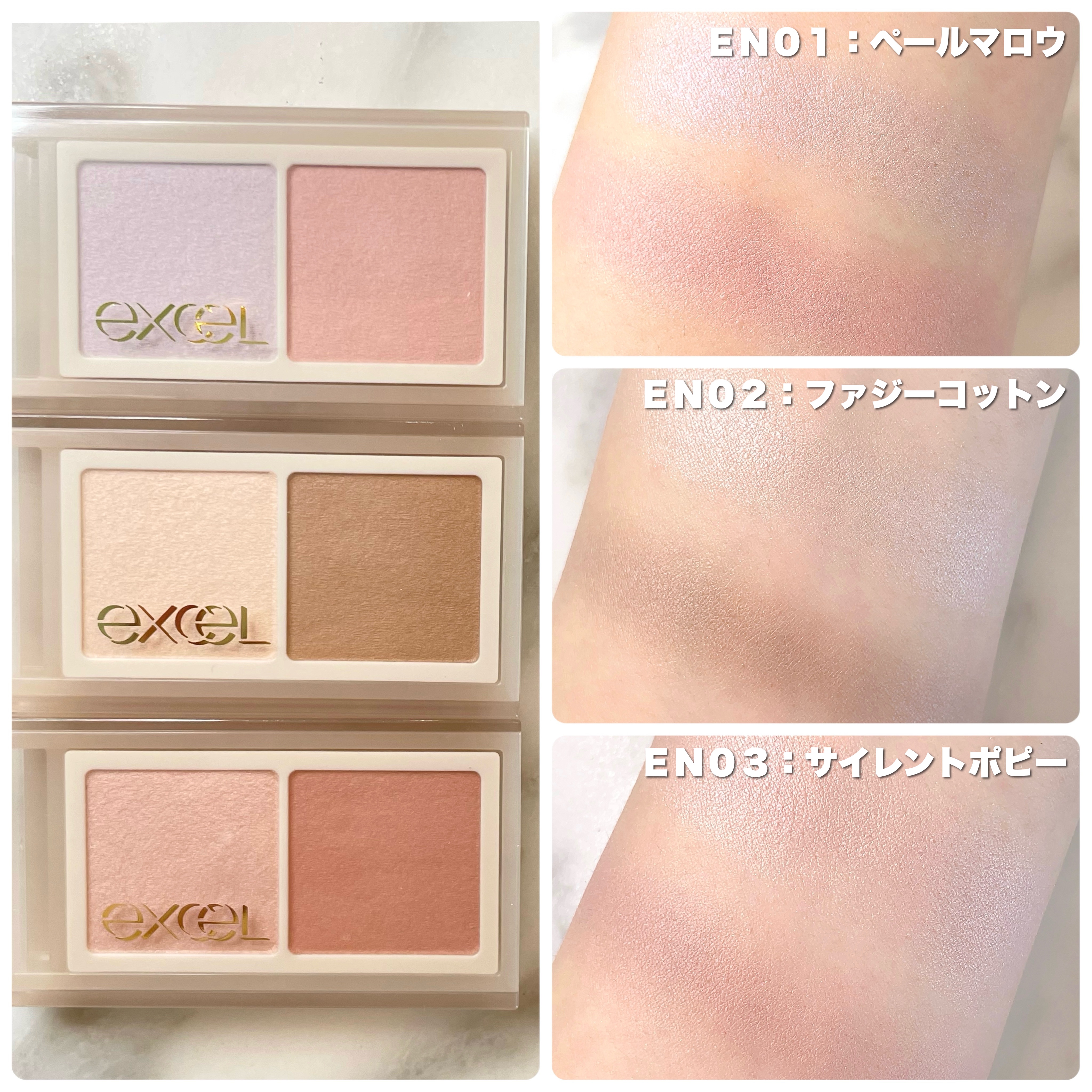 - [PERFORMANCE] 絶妙2トーンカラーで目元に軽やかな彩りを添えるまろやか発色の“引き算メイク”アイシャドウ [QUALITY] 1.素材の美しさを引き出すニュアンスミュートカラー 質感の異なる2色が重なり合い表情をやわらかに彩る 2.まぶたに溶け込むように馴染むソフトマットな水彩発色 テクニック要らずでラフに重ねて立体感をプラス 3.リッチな質感の密着パウダー処方で粉飛びしにくい 4.スクワラン(保湿)配合で目元の乾燥を防ぐ [DESIGN] ・片手で開いてさっと塗れるスライド式容器 ・スリムでコンパクトだからポーチの中でかさばらない ★なりたい印象に合わせて選べる3 色★ EN01 ペールマロウ 透明感ライラックでやさしく儚げな印象に EN02 ファジーコットン 陰影ベージュカラーで奥深い落ち着いた印象に EN03 サイレントポピー 血色ピンクカラーでピュアな可愛らしい印象に 10月15日(火)~エクセル公式オンラインショップ、アマゾンにて先行発売