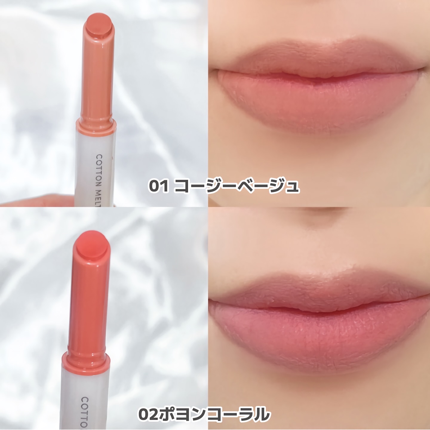 - ふんわりマシュマロ唇が作れちゃう「コットンメルティングリップ」が登場! シアバターと8種のヒアルロン酸配合で、マットリップなのに軽やかにうるおう新概念リップです。 イエベ・ブルべ問わず肌馴染みのいい7色展開で、いずれも落ち着いたミュートカラーが特徴。唇の質感をふんわりとぼかしながらマシュマロのような唇を演出します。 さらにチークやアイシャドウ、シェーディングにも使えるマルチユース。 1本ポーチに忍ばせればメイク直しも簡単です。