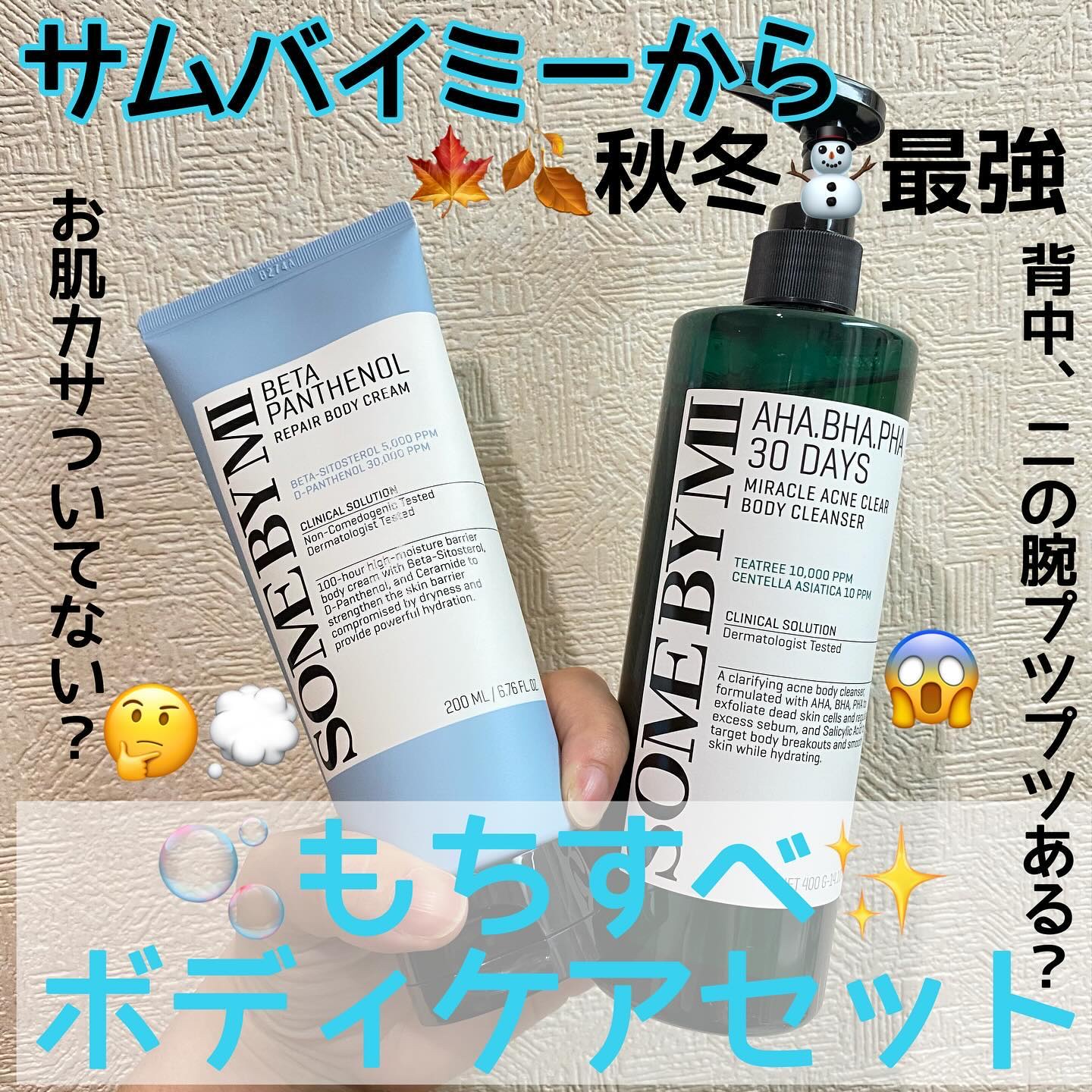 秋冬!最強もちすべボディセットは、ボディクレンザーで乾燥による肌の角質をケアし、ボディクリームでしっとり保湿ケアができるボディケアセット。 AHA.BHA.PHA 30デイズミラクルアクネボディクレンザーは、柔らかいすべすべボディ作りや秋冬のゴワつき肌対策、滑らかなボディの土台作り、ヒートテックによる背中ムレ対策ができるアイテムです😊 ベターパンテノールリペアボディクリームは、もちもちボディ作りができるボディクリーム。乾燥による赤みやかゆみなどの肌荒れケアができ、肌のバリア機能のケアもサポートしてくれます✨