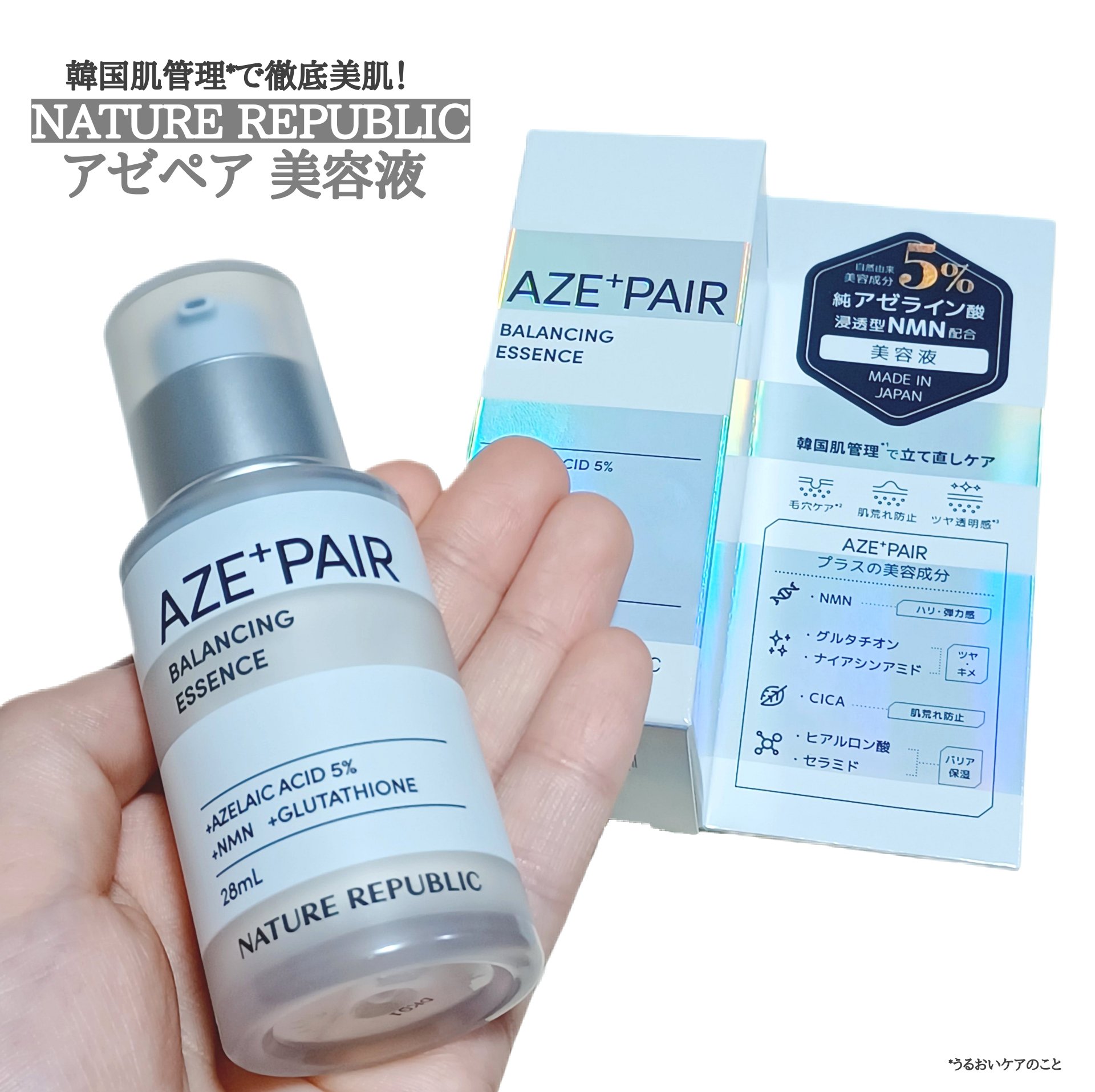 - 【韓国の肌管理*から発想を得たアゼペア】 高濃度*1の純アゼライン酸*2と厳選した美容成分が皮脂トラブル*3や肌荒れをしっかり防ぎながらも毛穴*4をケアして透明感*5のある肌へと整えます。 美容液には純アゼライン酸*2を5%配合しており、ミルクタイプのエッセンスが濃密なうるおいを素肌に届けます。普段のスキンケアにプラスするだけで皮脂トラブル*3をケアし、肌荒れを防ぎます。 先行発売:2024年8月31日よりロフト、PLAZA・MINiPLA、公式オンラインストアにて先行発売。 *うるおいケアのこと*1当社比*2保湿成分*3過剰な皮脂の分泌による肌荒れのこと*4乾燥によって開いた毛穴のこと*5うるおいを与えることによる肌印象のこと