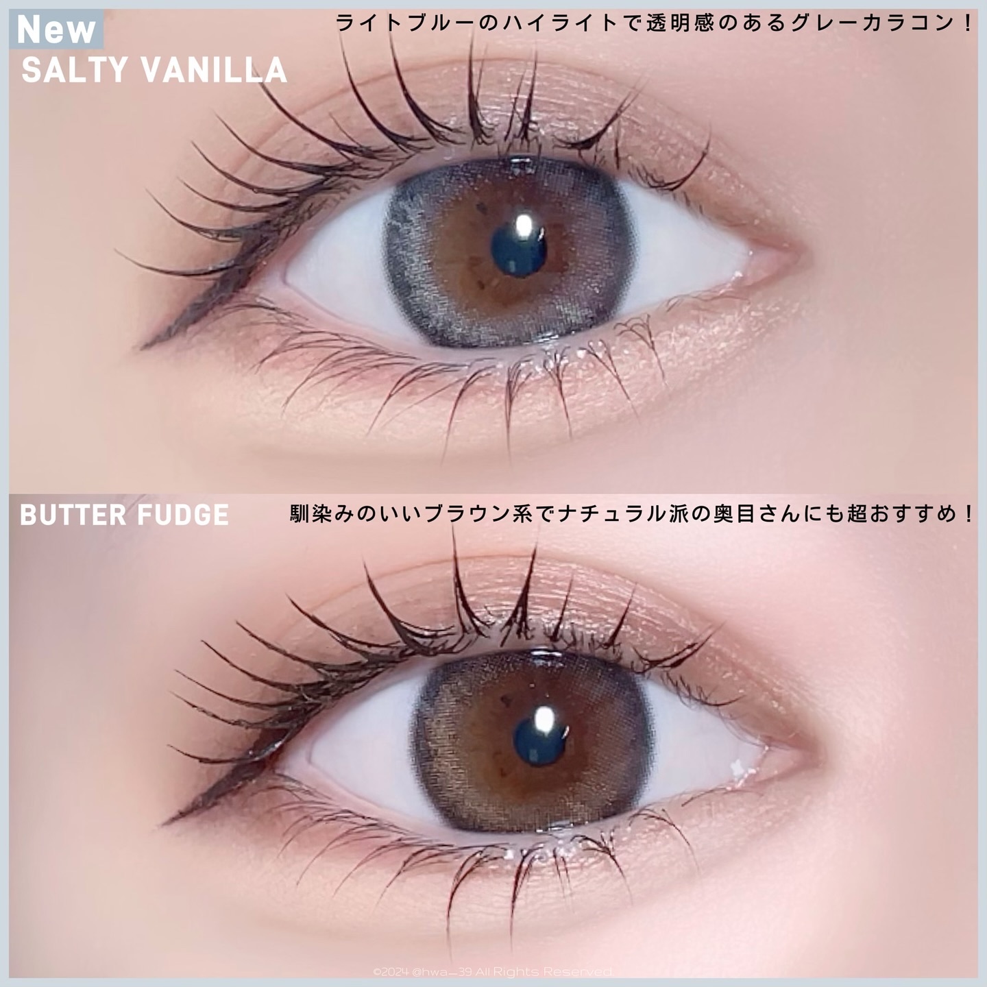新色バターファッジの色違い、モアコンタクト限定カラー ソルティーバニラ♡ 大きめの着色直径と、濃い茶フチでくりっとしっかり盛れるタイプ 黒目に馴染むグレーにキラッと輝くデザインがひやっとした透明感を出してくれるよ〜!