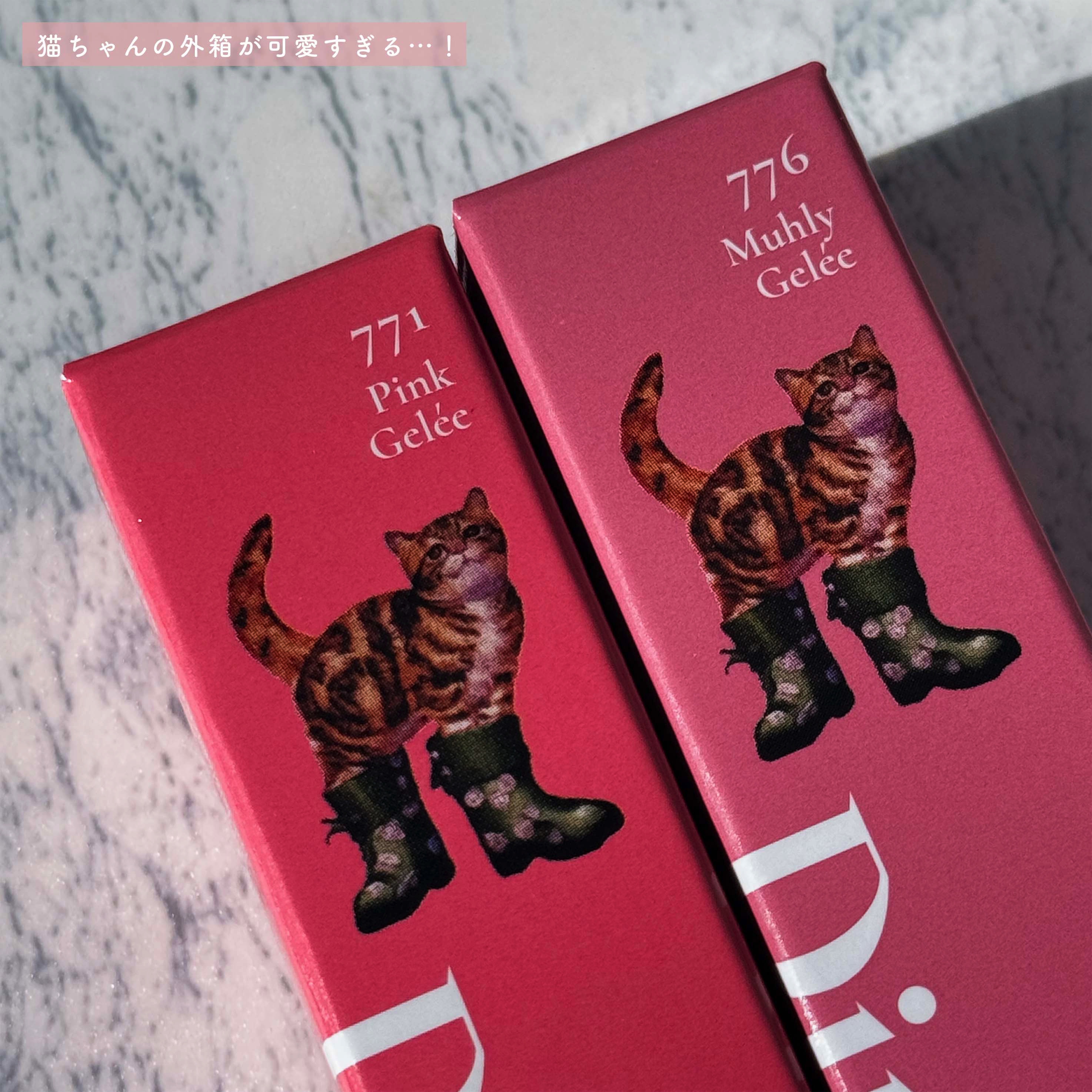 猫の肉球を表現したティントリップ◡̈ 771 ピンクジュレ 猫のぷりっとするピンクゼリーのカラー ほんのり黄みを感じるピンクカラーです。 ゼリーのようにぷっくりとしたツヤと水分たっぷりの唇を演出してくれるリップです。