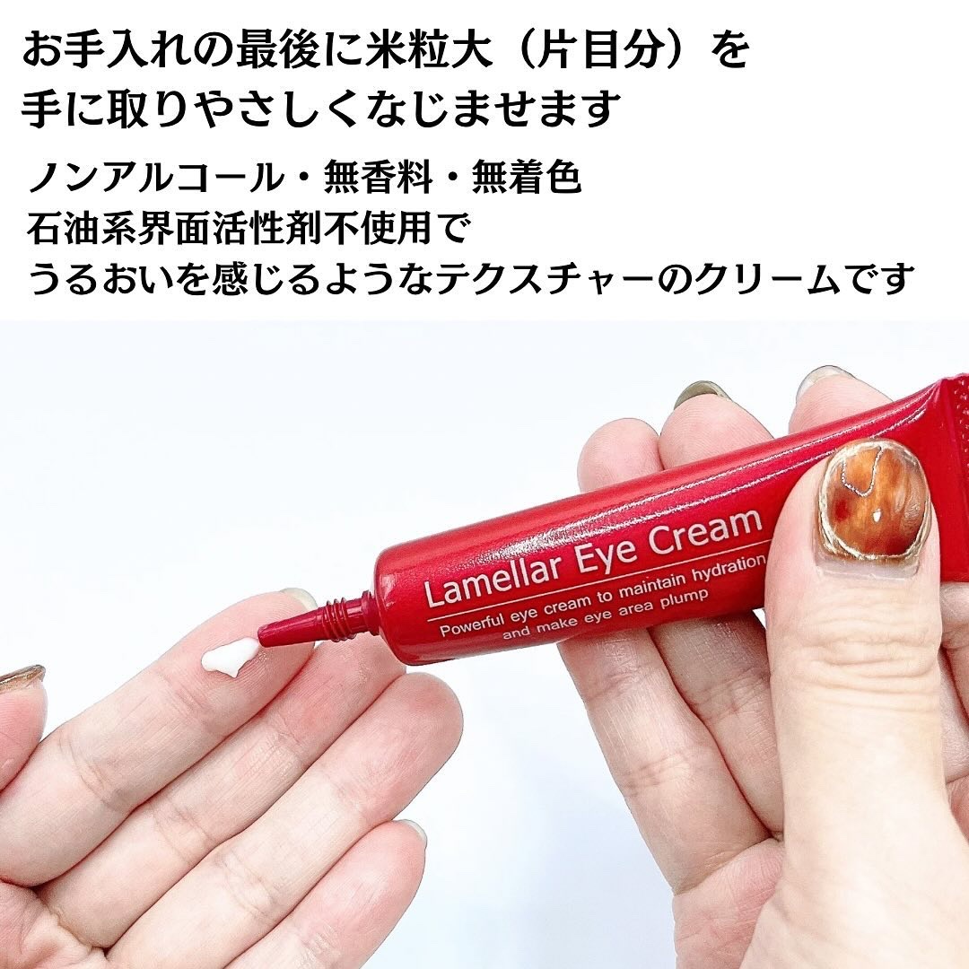 目元の皮膚って他に比べて1/3程度の薄さしかないの知ってた?そのうえ皮脂分泌もすくないし毎日数万回のまばたきで負荷がかかるから悩みでやすいよね😩 特許技術のラメラテクノロジー(R)ラメラ構造のクリーム一般のクリームと比較して浸透が2倍近くあることが確認されているよ スピーディ&リッチな浸透感で、内側からふっくらと持ちあがるような目元に
