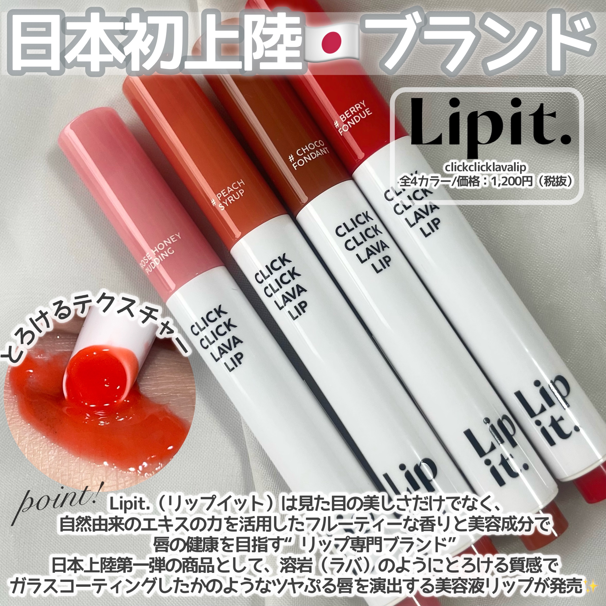 SNS総フォロワー350万超え* タイNo.1**インフルエンサープロデュースのリップ専門ブランド「Lipit.(リップイット)」が遂に日本初上陸⭐️ Lipit.(リップイット)は見た目の美しさだけでなく、自然由来のエキスの力を活用したフルーティーな香りと美容成分で唇の健康を目指す“リップ専門ブランド”💕 日本上陸第一弾の商品は、溶岩(ラバ)のようにとろける質感でガラスコーティングしたかのようなツヤぷる唇を演出する美容液リップ❤️