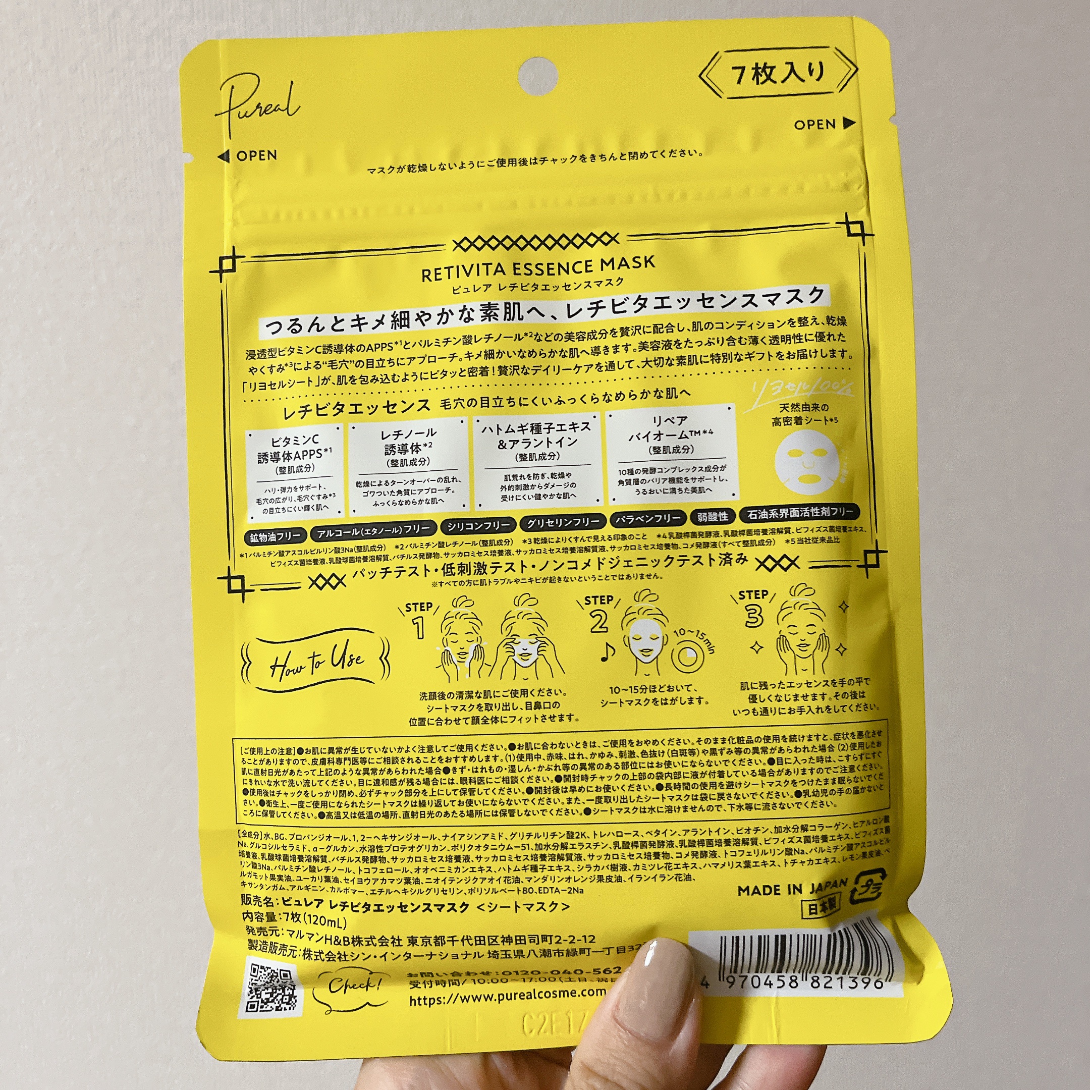 ピュレアレチビタエッセンスマスク7枚 120ml ¥660リピート買いです!グリセリンフリーのシートマスクを探していたのでとても良かったです🍋日焼けした時に使用してます!公式サイトから引用させて頂きます。浸透型ビタミンC誘導体APPSとパルミ...