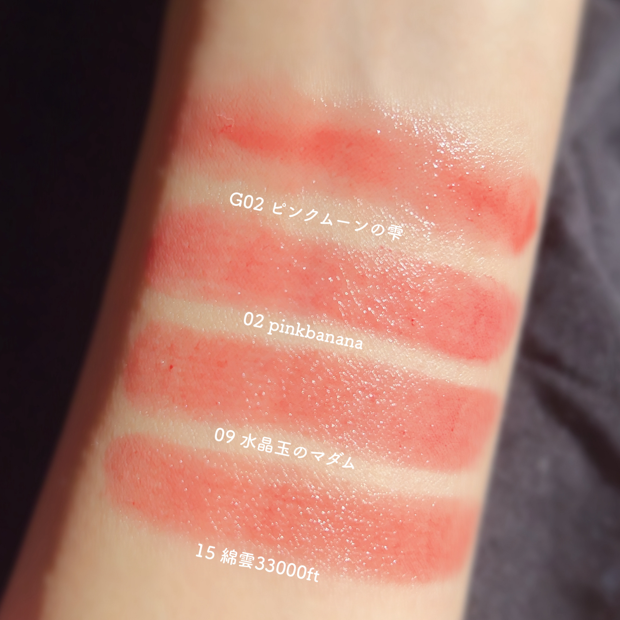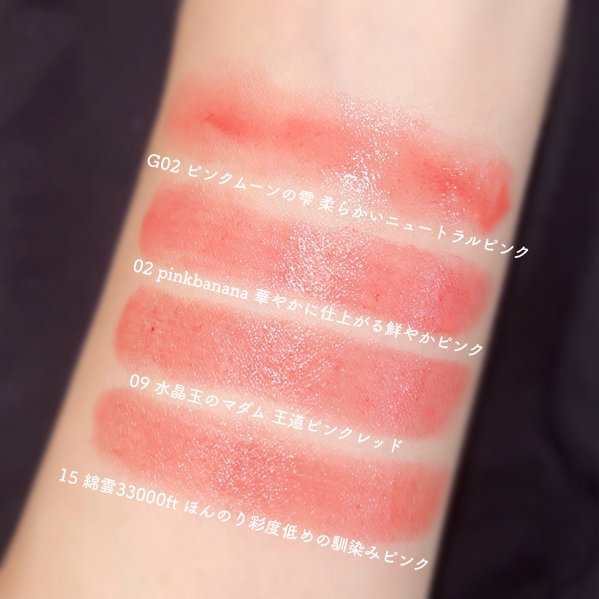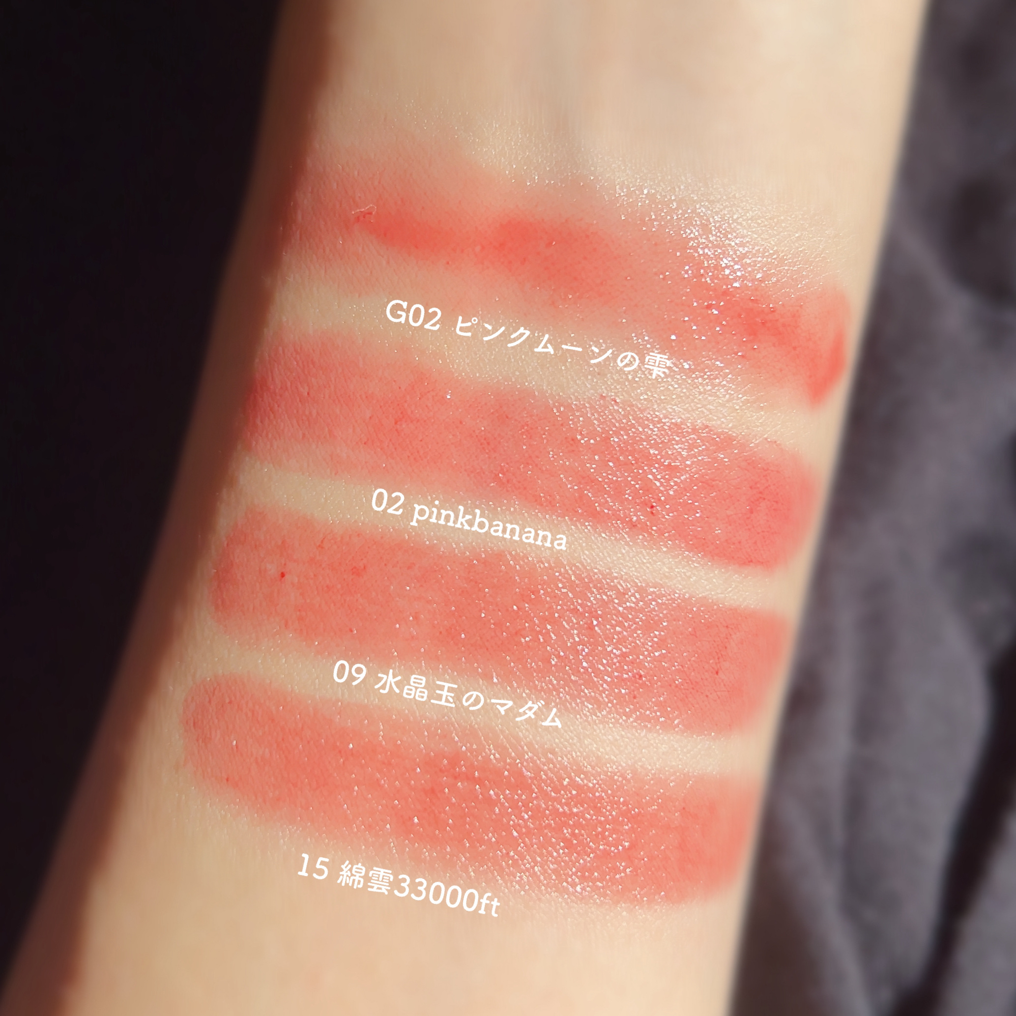 - <G01 明後日の水たまり> テトライソステアリン酸ジペンタエリスリチル、オクチルドデカノール、水添ポリイソブテン、トリ(カプリル酸/カプリン酸)グリセリル、ビスアルキル(C16-18)グリセリルウンデシルジメチコン、パラフィン、ダイマージリノール酸(フィトステリル/イソステアリル/セチル/ステアリル/ベヘニル)、ラウロイルグルタミン酸ジ(オクチルドデシル/フィトステリル/ベヘニル)、合成ワックス、マイクロクリスタリンワックス、ヒドロキシステアリン酸エチルヘキシル、トコフェロール、ホホバ種子油、オリーブ果実油、アーモンド油、ジメチコン、ヒアルロン酸Na、(+/-)ラウロイルアスパラギン酸Na、ラウロイルリシン、塩化亜鉛、酸化チタン、酸化鉄、水酸化Al、硫酸Ba、トリイソステアリン酸イソプロピルチタン、合成フルオロフロゴパイト、赤201、赤202 <G02 ピンクムーンの雫> テトライソステアリン酸ジペンタエリスリチル、オクチルドデカノール、水添ポリイソブテン、トリ(カプリル酸/カプリン酸)グリセリル、ビスアルキル(C16-18)グリセリルウンデシルジメチコン、パラフィン、ダイマージリノール酸(フィトステリル/イソステアリル/セチル/ステアリル/ベヘニル)、ラウロイルグルタミン酸ジ(オクチルドデシル/フィトステリル/ベヘニル)、合成ワックス、マイクロクリスタリンワックス、ヒドロキシステアリン酸エチルヘキシル、トコフェロール、ホホバ種子油、オリーブ果実油、アーモンド油、ジメチコン、ヒアルロン酸Na、(+/-)ラウロイルアスパラギン酸Na、ラウロイルリシン、塩化亜鉛、酸化チタン、酸化鉄、水酸化Al、硫酸Ba、トリイソステアリン酸イソプロピルチタン、合成フルオロフロゴパイト、赤201、赤202 <G03 99.9°C> テトライソステアリン酸ジペンタエリスリチル、オクチルドデカノール、水添ポリイソブテン、トリ(カプリル酸/カプリン酸)グリセリル、ビスアルキル(C16-18)グリセリルウンデシルジメチコン、パラフィン、ダイマージリノール酸(フィトステリル/イソステアリル/セチル/ステアリル/ベヘニル)、ラウロイルグルタミン酸ジ(オクチルドデシル/フィトステリル/ベヘニル)、合成ワックス、マイクロクリスタリンワックス、ヒドロキシステアリン酸エチルヘキシル、トコフェロール、ホホバ種子油、オリーブ果実油、アーモンド油、ジメチコン、ヒアルロン酸Na、(+/-)ラウロイルアスパラギン酸Na、ラウロイルリシン、塩化亜鉛、酸化チタン、酸化鉄、水酸化Al、硫酸Ba、トリイソステアリン酸イソプロピルチタン、合成フルオロフロゴパイト、赤201、赤202 <G04 スパイダー リリー調香師> テトライソステアリン酸ジペンタエリスリチル、オクチルドデカノール、水添ポリイソブテン、トリ(カプリル酸/カプリン酸)グリセリル、ビスアルキル(C16-18)グリセリルウンデシルジメチコン、パラフィン、ダイマージリノール酸(フィトステリル/イソステアリル/セチル/ステアリル/ベヘニル)、ラウロイルグルタミン酸ジ(オクチルドデシル/フィトステリル/ベヘニル)、合成ワックス、マイクロクリスタリンワックス、ヒドロキシステアリン酸エチルヘキシル、リンゴ酸ジイソステアリル、トコフェロール、ホホバ種子油、オリーブ果実油、アーモンド油、ジメチコン、ヒアルロン酸Na、(+/-)(チタン/酸化チタン)焼結物、ラウロイルアスパラギン酸Na、ラウロイルリシン、塩化亜鉛、酸化チタン、酸化鉄、水酸化Al、トリイソステアリン酸イソプロピルチタン、トリエトキシカプリリルシラン、合成フルオロフロゴパイト、青1、赤202 <G05 ピンク ロビンの泉> テトライソステアリン酸ジペンタエリスリチル、オクチルドデカノール、水添ポリイソブテン、トリ(カプリル酸/カプリン酸)グリセリル、ビスアルキル(C16-18)グリセリルウンデシルジメチコン、パラフィン、ダイマージリノール酸(フィトステリル/イソステアリル/セチル/ステアリル/ベヘニル)、ラウロイルグルタミン酸ジ(オクチルドデシル/フィトステリル/ベヘニル)、合成ワックス、マイクロクリスタリンワックス、ヒドロキシステアリン酸エチルヘキシル、リンゴ酸ジイソステアリル、トコフェロール、ホホバ種子油、オリーブ果実油、アーモンド油、ジメチコン、ヒアルロン酸Na、(+/-)(チタン/酸化チタン)焼結物、ラウロイルアスパラギン酸Na、ラウロイルリシン、塩化亜鉛、酸化チタン、酸化鉄、水酸化Al、トリイソステアリン酸イソプロピルチタン、トリエトキシカプリリルシラン、合成フルオロフロゴパイト、青1、赤202 <EX-1 哀愁の亡霊 (限定色)> テトライソステアリン酸ジペンタエリスリチル、オクチルドデカノール、水添ポリイソブテン、トリ(カプリル酸/カプリン酸)グリセリル、ビスアルキル(C16-18)グリセリルウンデシルジメチコン、パラフィン、ダイマージリノール酸(フィトステリル/イソステアリル/セチル/ステアリル/ベヘニル)、ラウロイルグルタミン酸ジ(オクチルドデシル/フィトステリル/ベヘニル)、合成ワックス、マイクロクリスタリンワックス