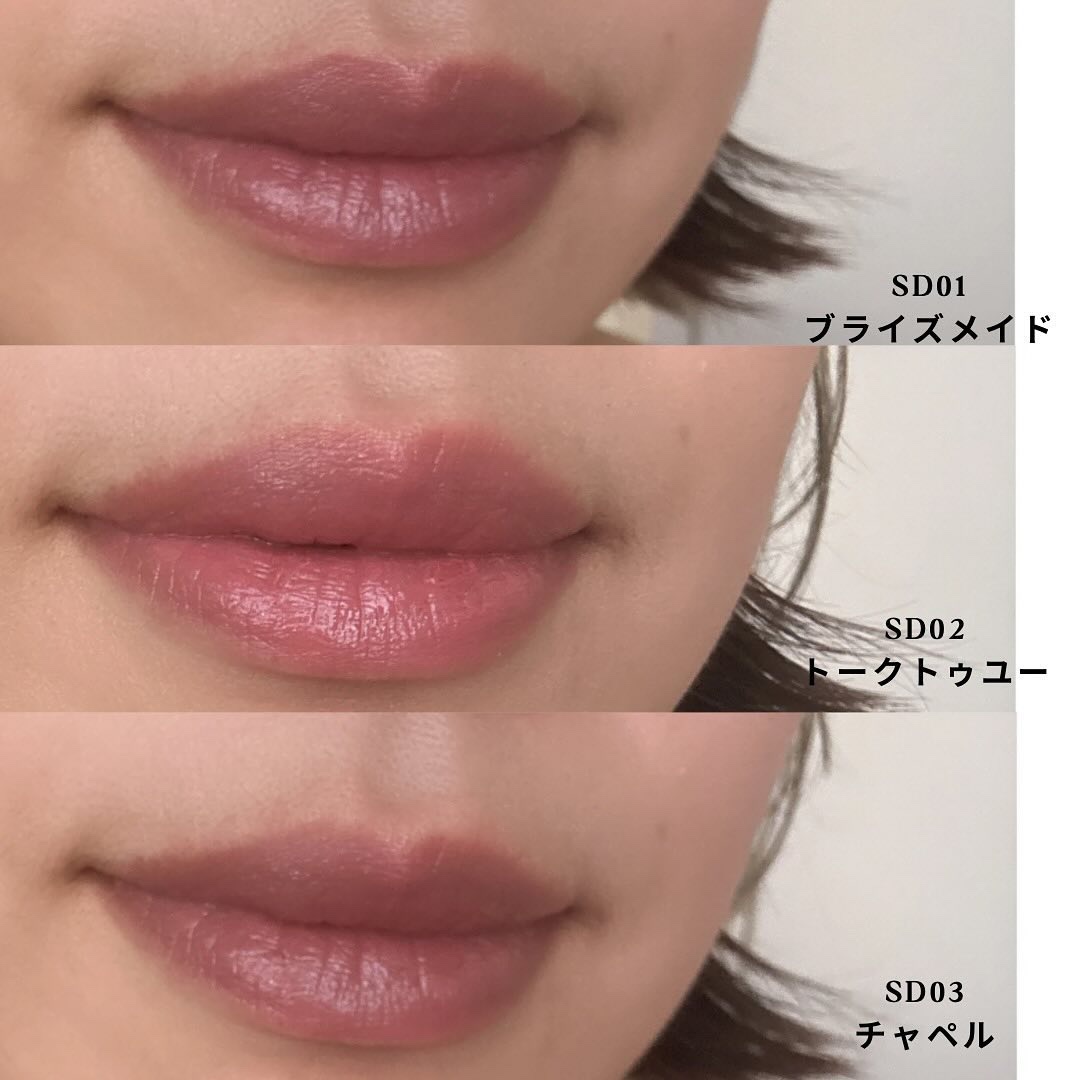- <SD01 ブライズメイド> 水添ポリイソブテン、トリエチルヘキサノイン、ダイマージリノール酸ジ(イソステアリル/フィトステリル)、デカイソステアリン酸ポリグリセリル-10、トリメチルペンタフェニルトリシロキサン、合成ワックス、リンゴ酸ジイソステアリル、ジフェニルシロキシフェニルトリメチコン、ワセリン、トリメチルシロキシフェニルジメチコン、マイクロクリスタリンワックス、バニリルブチル、メントキシプロパンジオール、ヒアルロン酸クロスポリマーNa、加水分解コラーゲン、ホホバ種子油、オリーブ果実油、ブドウ種子油、マカデミア種子油、アボカド油、アルガニアスピノサ核油、カニナバラ果実油、アーモンド油、アンズ核油、メドウフォーム種子油、(ジイソステアリン酸/ポリヒドロキシステアリン酸/セバシン酸)ポリグリセリル-4、イソステアリン酸Na、カルナウバロウ、キャンデリラロウエステルズ、ステアリン酸エチルヘキシル、セスキイソステアリン酸ソルビタン、トコフェロール、ハイドロゲンジメチコン、ホウケイ酸(Ca/Al)、水、(+/-)シリカ、ラウロイルリシン、黄4、黄5、酸化チタン、酸化鉄、水酸化Al、青1、赤201、赤202 <SD02 トークトゥユー > 水添ポリイソブテン、トリエチルヘキサノイン、ダイマージリノール酸ジ(イソステアリル/フィトステリル)、デカイソステアリン酸ポリグリセリル-10、トリメチルペンタフェニルトリシロキサン、合成ワックス、リンゴ酸ジイソステアリル、ジフェニルシロキシフェニルトリメチコン、ワセリン、トリメチルシロキシフェニルジメチコン、マイクロクリスタリンワックス、バニリルブチル、メントキシプロパンジオール、ヒアルロン酸クロスポリマーNa、加水分解コラーゲン、ホホバ種子油、オリーブ果実油、ブドウ種子油、マカデミア種子油、アボカド油、アルガニアスピノサ核油、カニナバラ果実油、アーモンド油、アンズ核油、メドウフォーム種子油、(ジイソステアリン酸/ポリヒドロキシステアリン酸/セバシン酸)ポリグリセリル-4、イソステアリン酸Na、カルナウバロウ、キャンデリラロウエステルズ、ステアリン酸エチルヘキシル、セスキイソステアリン酸ソルビタン、トコフェロール、ハイドロゲンジメチコン、ホウケイ酸(Ca/Al)、水、(+/-)シリカ、ラウロイルリシン、黄4、黄5、酸化チタン、酸化鉄、水酸化Al、青1、赤201、赤202 <SD03 チャペル> 水添ポリイソブテン、トリエチルヘキサノイン、ダイマージリノール酸ジ(イソステアリル/フィトステリル)、デカイソステアリン酸ポリグリセリル-10、トリメチルペンタフェニルトリシロキサン、合成ワックス、リンゴ酸ジイソステアリル、ジフェニルシロキシフェニルトリメチコン、ワセリン、トリメチルシロキシフェニルジメチコン、マイクロクリスタリンワックス、バニリルブチル、メントキシプロパンジオール、ヒアルロン酸クロスポリマーNa、加水分解コラーゲン、ホホバ種子油、オリーブ果実油、ブドウ種子油、マカデミア種子油、アボカド油、アルガニアスピノサ核油、カニナバラ果実油、アーモンド油、アンズ核油、メドウフォーム種子油、(ジイソステアリン酸/ポリヒドロキシステアリン酸/セバシン酸)ポリグリセリル-4、イソステアリン酸Na、カルナウバロウ、キャンデリラロウエステルズ、ステアリン酸エチルヘキシル、セスキイソステアリン酸ソルビタン、トコフェロール、ハイドロゲンジメチコン、ホウケイ酸(Ca/Al)、水、(+/-)シリカ、ラウロイルリシン、黄4、黄5、酸化チタン、酸化鉄、水酸化Al、青1、赤201、赤202 <SD04 オネストラブ> 水添ポリイソブテン、トリエチルヘキサノイン、ダイマージリノール酸ジ(イソステアリル/フィトステリル)、デカイソステアリン酸ポリグリセリル-10、トリメチルペンタフェニルトリシロキサン、合成ワックス、リンゴ酸ジイソステアリル、ジフェニルシロキシフェニルトリメチコン、ワセリン、トリメチルシロキシフェニルジメチコン、マイクロクリスタリンワックス、バニリルブチル、メントキシプロパンジオール、ヒアルロン酸クロスポリマーNa、加水分解コラーゲン、ホホバ種子油、オリーブ果実油、ブドウ種子油、マカデミア種子油、アボカド油、アルガニアスピノサ核油、カニナバラ果実油、アーモンド油、アンズ核油、メドウフォーム種子油、(ジイソステアリン酸/ポリヒドロキシステアリン酸/セバシン酸)ポリグリセリル-4、イソステアリン酸Na、カルナウバロウ、キャンデリラロウエステルズ、ステアリン酸エチルヘキシル、セスキイソステアリン酸ソルビタン、トコフェロール、ハイドロゲンジメチコン、ホウケイ酸(Ca/Al)、水、(+/-)シリカ、ラウロイルリシン、黄4、黄5、酸化チタン、酸化鉄、水酸化Al、青1、赤201、赤202 <SD05 エンドロール> 水添ポリイソブテン、トリエチルヘキサノイン、ダイマージリノール酸ジ(イソステアリル/フィトステリル)、デカイソステアリン酸ポリグリセリル-10、トリメチルペンタフェニルトリシロキサ