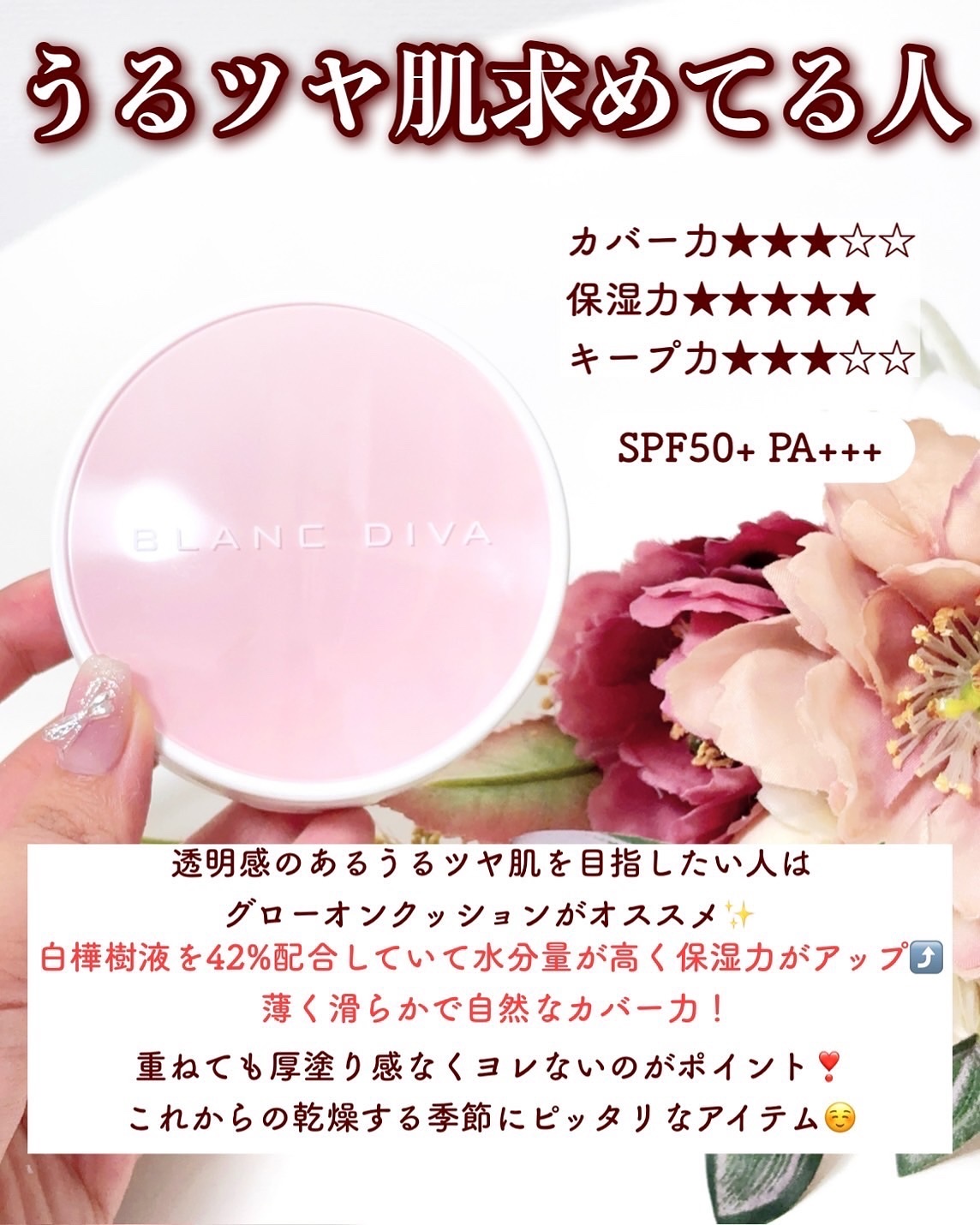 BLANCDIVAの🤍グリームカバレッジクッション🩵ウォーターベルベットクッションを紹介💁🏼♀️🤍グリームカバレッジクッションSPF50+PA+++微細粒子で毛穴やしわをしっかりカバー肌にフィットして皮脂の分泌を抑制パウダーにより、崩れない...