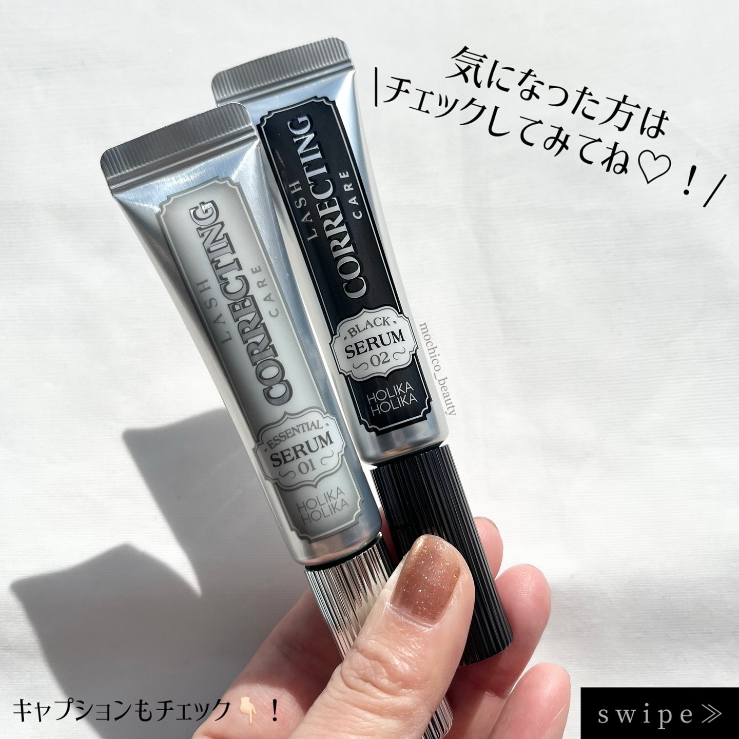 大好きなHOLIKA HOLIKA🍭 ラッシュコレクティングケアベスト組み合わせ企画セットだよ🥰 (エッセンシャルセラム+ブラックセラム) ブラックセラムは日中でもケアしながらナチュラルに仕上げられる! オイルフリーでまつエクやまつげパーマにも使えて、お湯で落とせるのが嬉しいポイント!