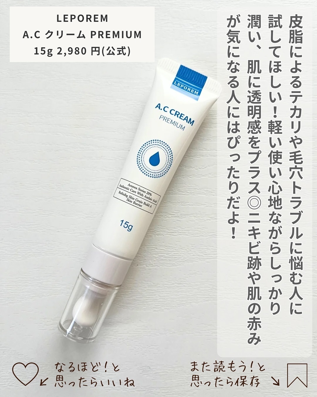 皮脂から来る肌トラブルに悩みを抱えている方にオススメ★ 水に溶けにくい性質のアゼライン酸を独自の製法で3~5μmに微粉化することに成功(他社平均値は20~30μm)⇨他社より圧倒的に細かい粒子! こっくりとしたクリームすぐに伸びて乾くとサラサラな使用感 圧倒的に細かい粒子のおかげなのか、ぴたっと密着し 塗った部分だけまるで艶消しクリームみたいな感触 純アゼライン酸を使用しているルポレムだからこその自信作なのがよくわかった~出会いに感謝 継続して使ってみたいと思います