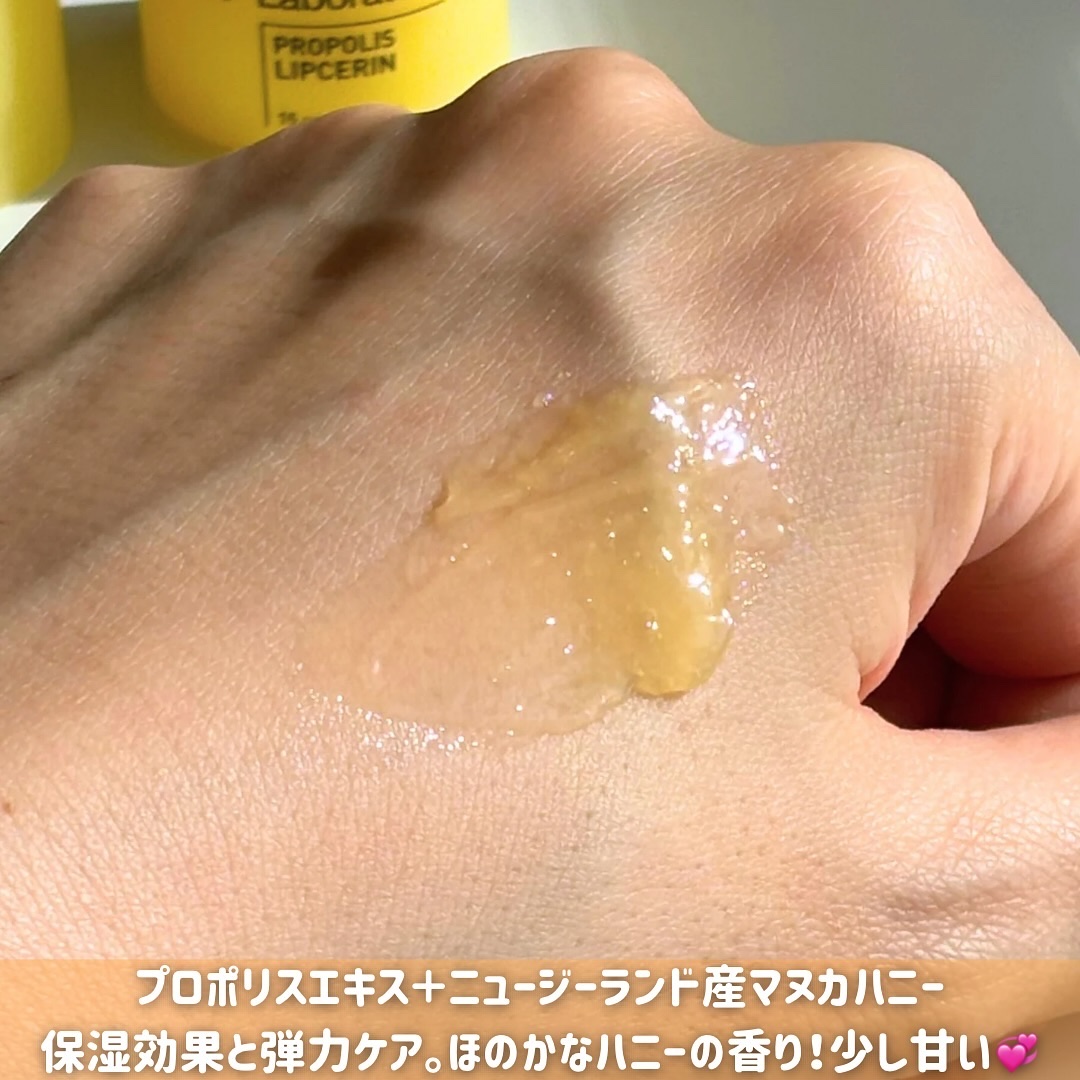 プロポリスとハチミツエキスでリップケア🍯✨ ✔️5大のリップトラブルを同時にケア (シワ、角質、保湿、弾力、潤い) 硬めのとろみテクスチャーでリップをしっかりケアできて、ハニーの香りがめっちゃ良い😍🍯 繰り出し式容器で衛生的に使えるのも高ポイント🙆♀️