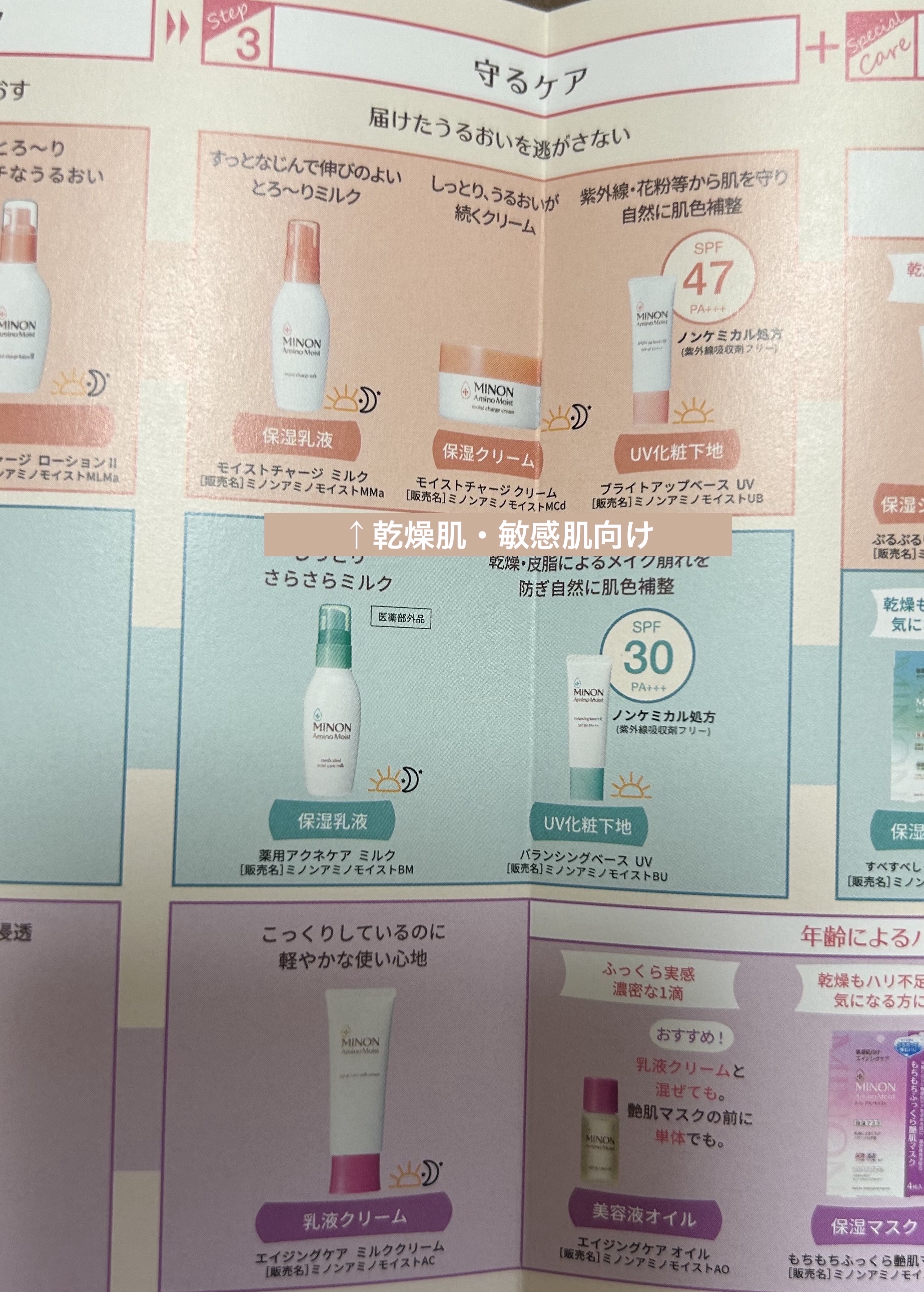 ミノン アミノモイストは敏感肌向けシリーズ。乾燥肌、混合肌、エイジングケアと3つのラインがあります。 全ライン共通で、9種の保潤アミノ酸配合・バリン・トレオニン・セリン・ロイシン・プロリン・ヒスチジン・グリシン・アラニン・アルギニン こっくりではなく軽めの質感のクリームで、馴染ませるとしっとり🫧