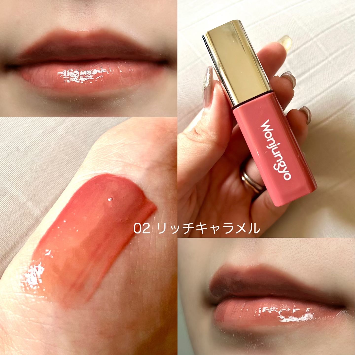 ウォンジョンヨの新作リップ、また売り切れる予感がして気になるカラーを購入しました…!ちゅるんどころかポテっとした厚みのあるテクスチャー。ぷるぷるの鎧(?)を唇に乗せているかのような、ボリューミーなリップに💄 このチャイティーピンクのカラー可愛すぎません?🥹💖ピンクベージュですが、程よい血色感があって唇が消えない🫥✨ ここまでぽってりしたティントは珍しい!ボリューミーなぷるぷるリップメイクをしたい人は要チェック❤️