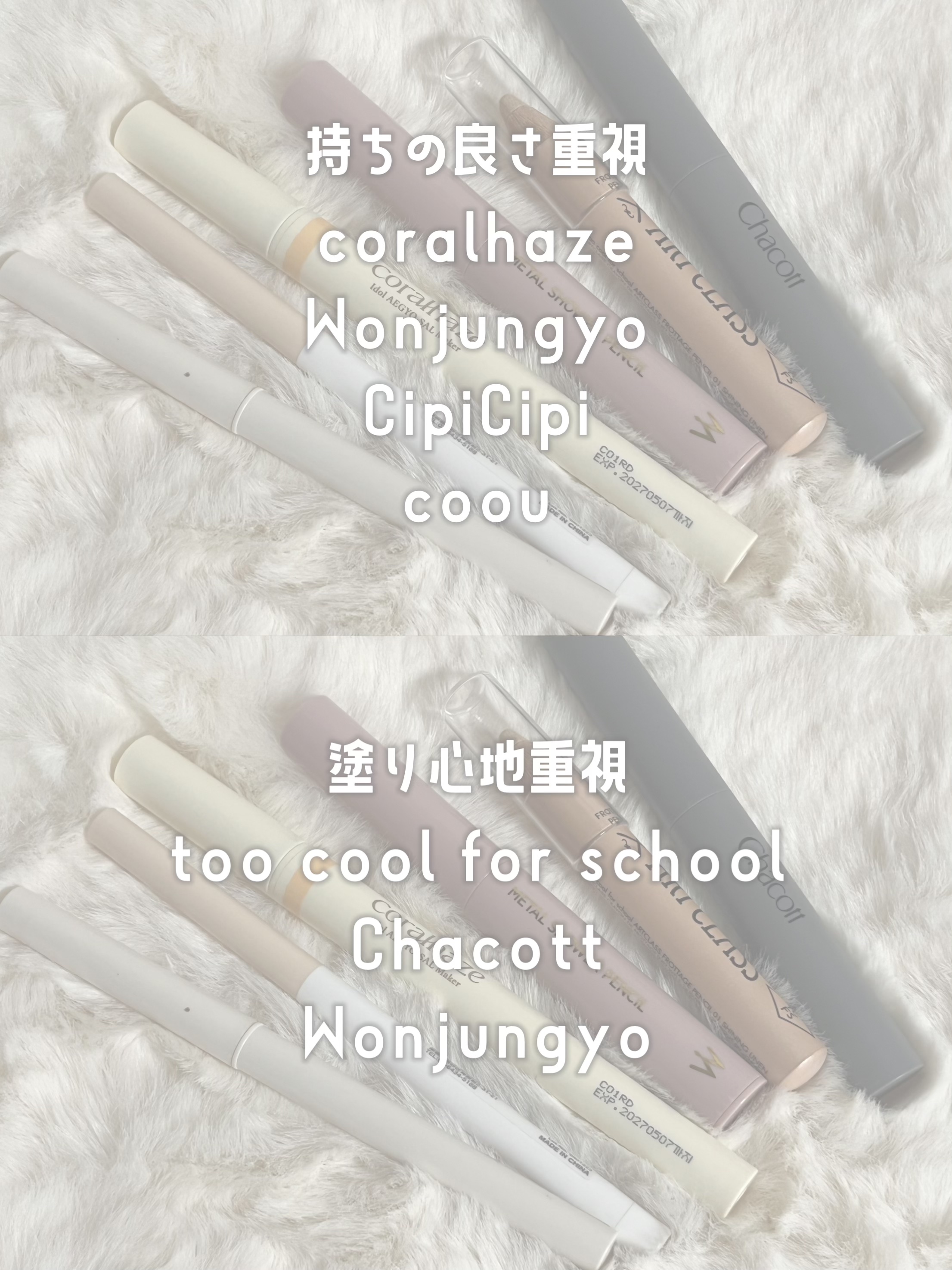 Wonjungyoの方はほんのり青みピンクでCipiCipiはミルキーピンクな色味で両方違った可愛さがあって比較するの楽しかった♡ 華やかなメイクが好きな人やブルベさんはWonjungyoでナチュラルメイクが好きな人や自然にぷっくり見せたい人はCipiCipiがおすすめです💕