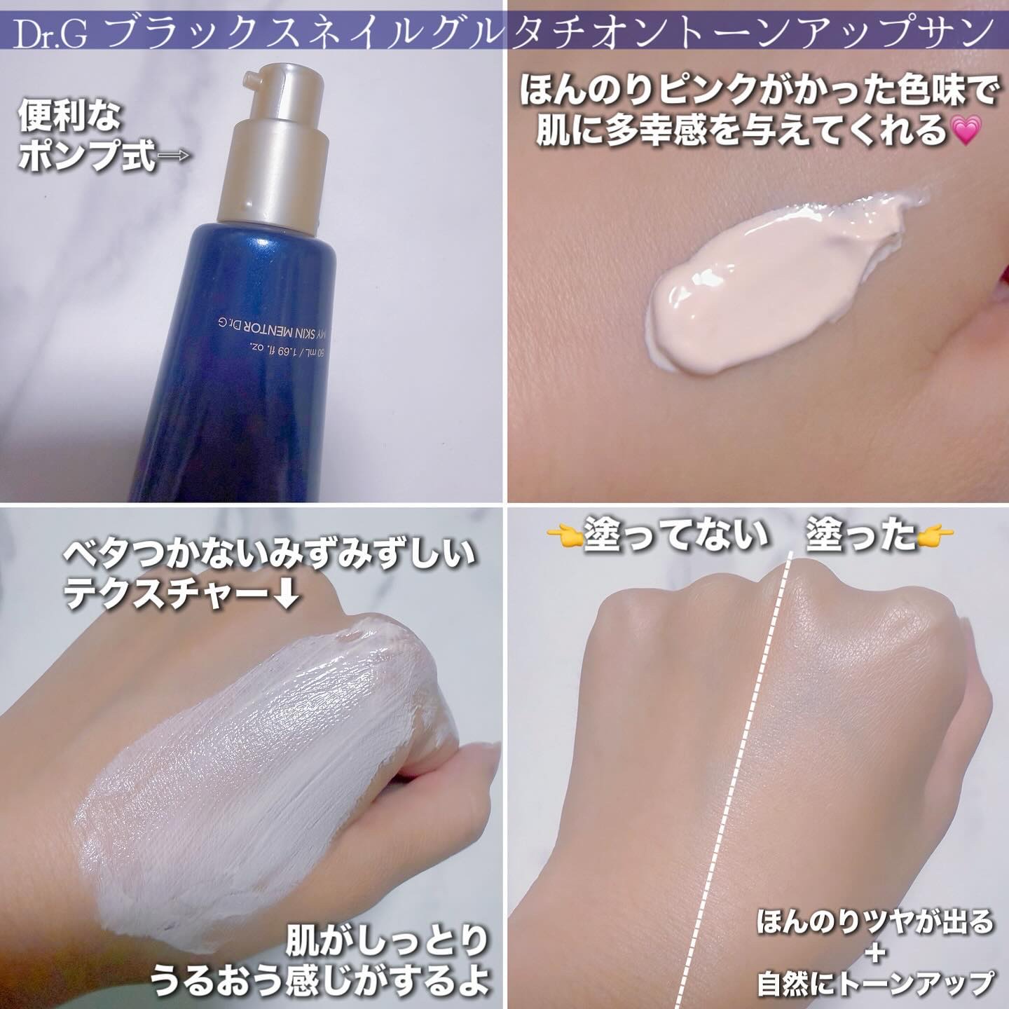 日焼け止めが優秀なドクタージーだけど、その中でもこれはスキンケア効果が高く化粧下地としても使える日焼け止め🧴 美白効果の高いグルタチオンやナイアシンアミド ヒアルロン酸も入ってる! ほんのりピンクがかった色は自然なトーンアップと多幸感💞