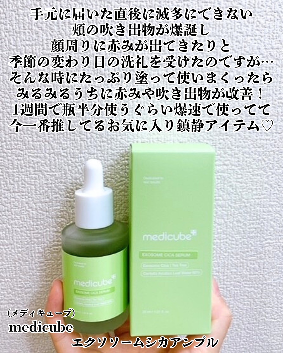 メディキューブのエクソソームシカはシカより5.3倍強く急速鎮静&水分チャージ! ニキビケアと水分ケアも叶えたい人におすすめ✨ ニキビ鎮静成分84%配合の高濃度アンプルで刺激を受けた部分に吸収された赤みを鎮静してニキビと美白ケアに優れたナイアシンアミドも配合してるよ! サラッとべたつきの少ないジェルっぽくも感じるテクスチャーで混合肌の私には使いやすい♡