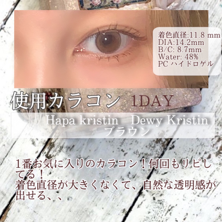 Hapakristin SecretiveKristenワンデータイプ、クリームブラウンを使用しました。まろやかに黄みがかったブラウンで、澄んだ印象の瞳になります。ものによるのかもしれませんが、レンズによって違和感を感じるときと、1日問題なく...
