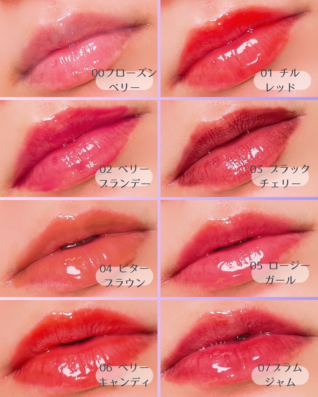 アプリコットティーとイチジクミルクはほんのりベビー感あふれる優しい発色で、ナチュラルメイクさんとか校則NGさんでもさりげなく使えるカラー🩷 ベリーヨーグルトは青みピンクがたまらんやつ!しっかり発色だけど派手すぎないのがまた良い✨ ザクロサワーとプラムワインはしっかり深めの発色で濃いめつよつよメイクが好きな私はめちゃくちゃ好き❤️