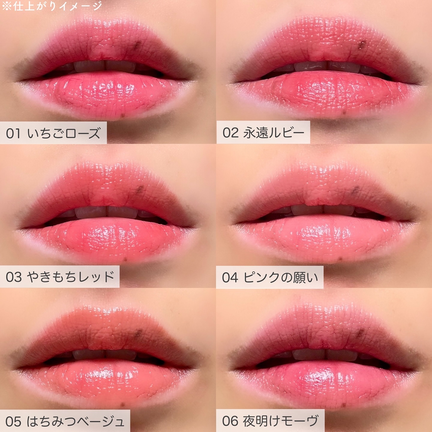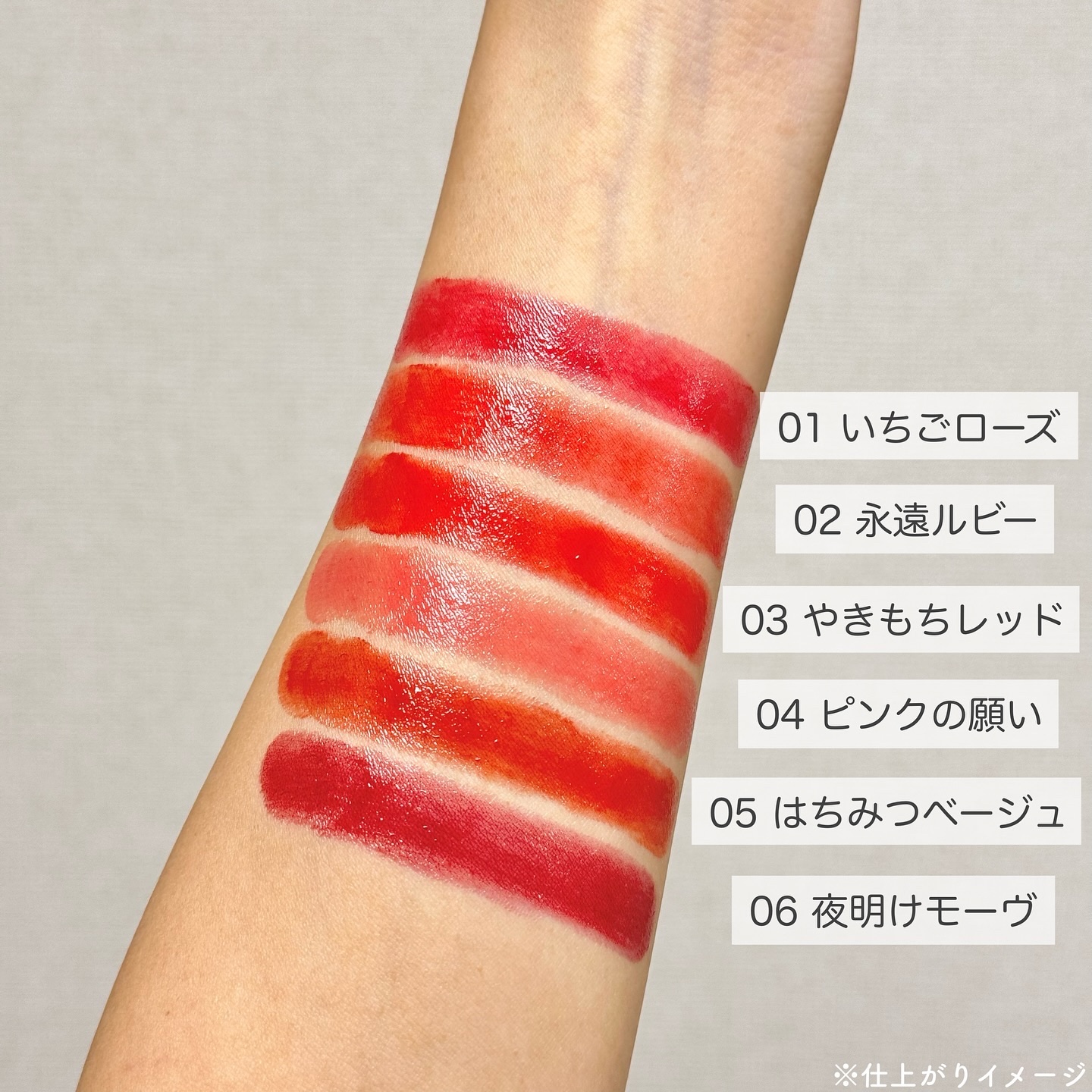 - ・じゅわっと透明感*¹ ある美発色 ティントでありながらも自然なリップカラーを演出。 見たまま美発色で唇を彩り、グロウなテクスチャーでありながらカラーフィクシングが可能。 ・ひと塗りでボリューム感*¹ と、とろける光沢感を演出 独自成分*² により反射光を効果的に演出し、唇の皺を見えにくくする。 また、モイスチャー感と光沢感もキープし、生ツヤっぽい光沢感を演出。 ・クリアなレイヤリングカラー 厚みのない、塗れば塗るほどきれいな発色。 ヌーディ系のライトとミュートカラー展開。 *¹ メイクアップ効果 *² アルミナ成分