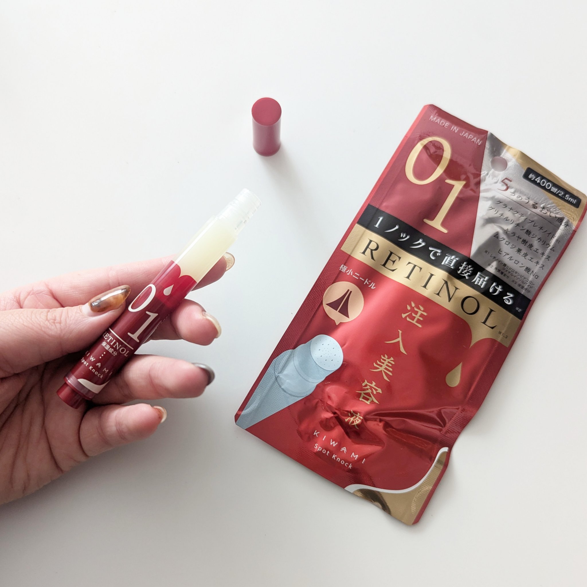 塗るより、貼るより、「直接届ける」新発想✨ 注入型レチノール(保湿成分)で肌の中からアプローチ 200μニードルの極小の針を気になる部分にノックして2秒~3秒待つだけ‼︎というお手軽さ✨ 1本で400ノック使えるとのことでコスパも🙆♀️