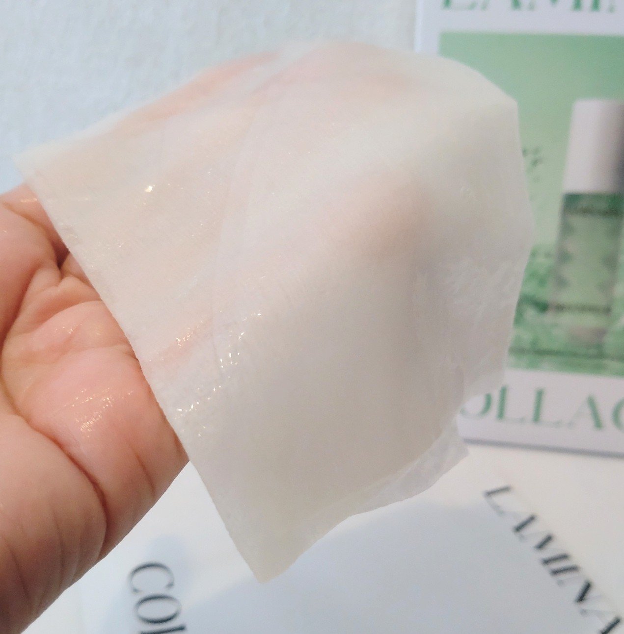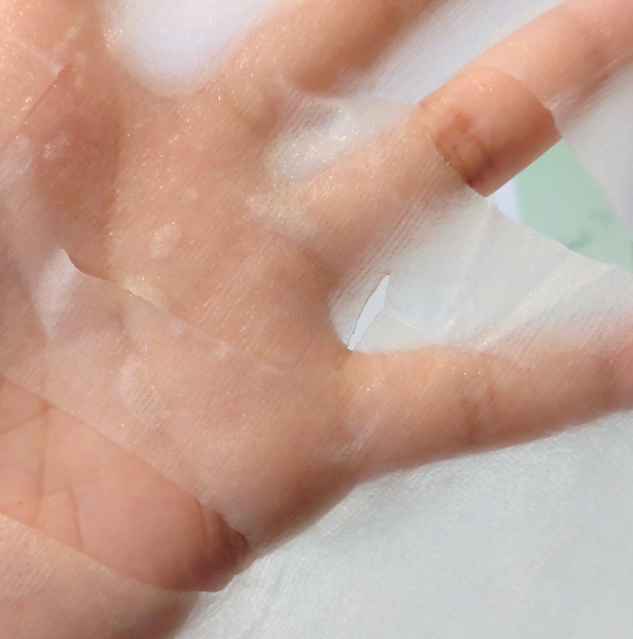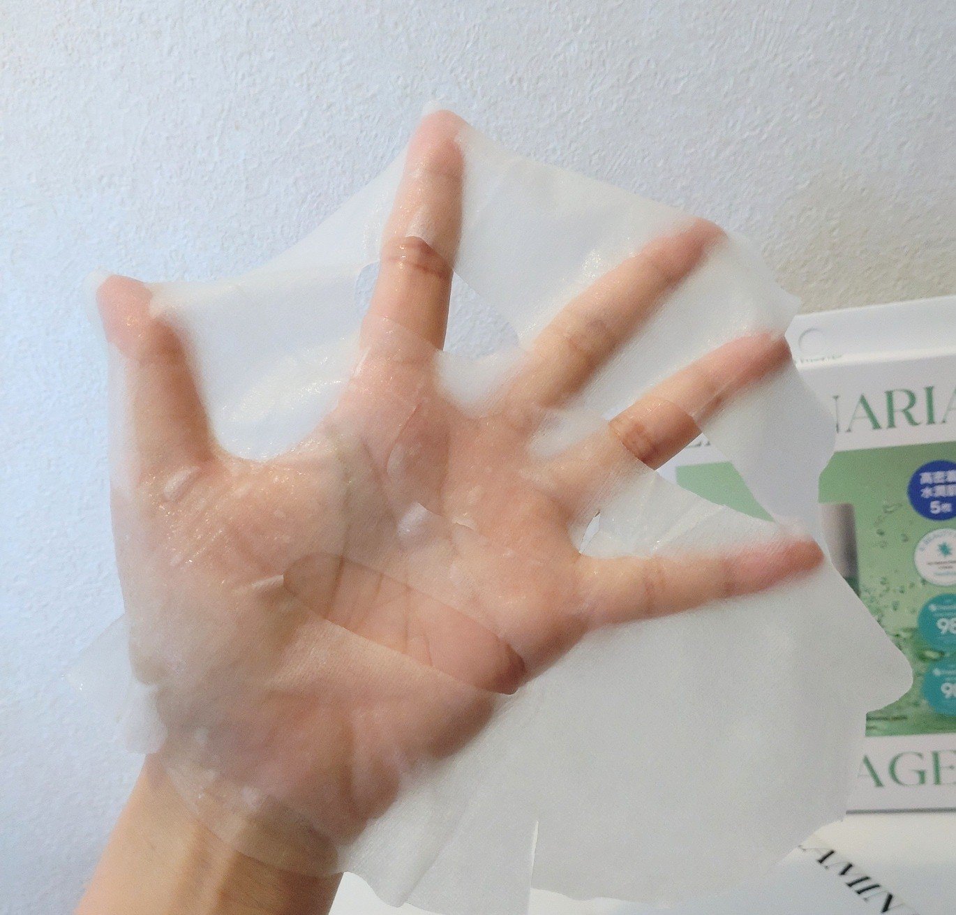マコンブ配合で糸引くテクスチャーのエッセンスがたーっぷりしみしみのフェイスマスクお試し✧*。 薄くてしっかりした生地にエッセンスがたっぷり〜🩷 5-10分間置いてからはがして残ったエッセンスを優しく押し込むようにすればOK👌🥰 保湿&肌を健やかにしてくれるよ🩵 マコンブ成分だけでなく5種のシカまで配合されてるよ💚🍃